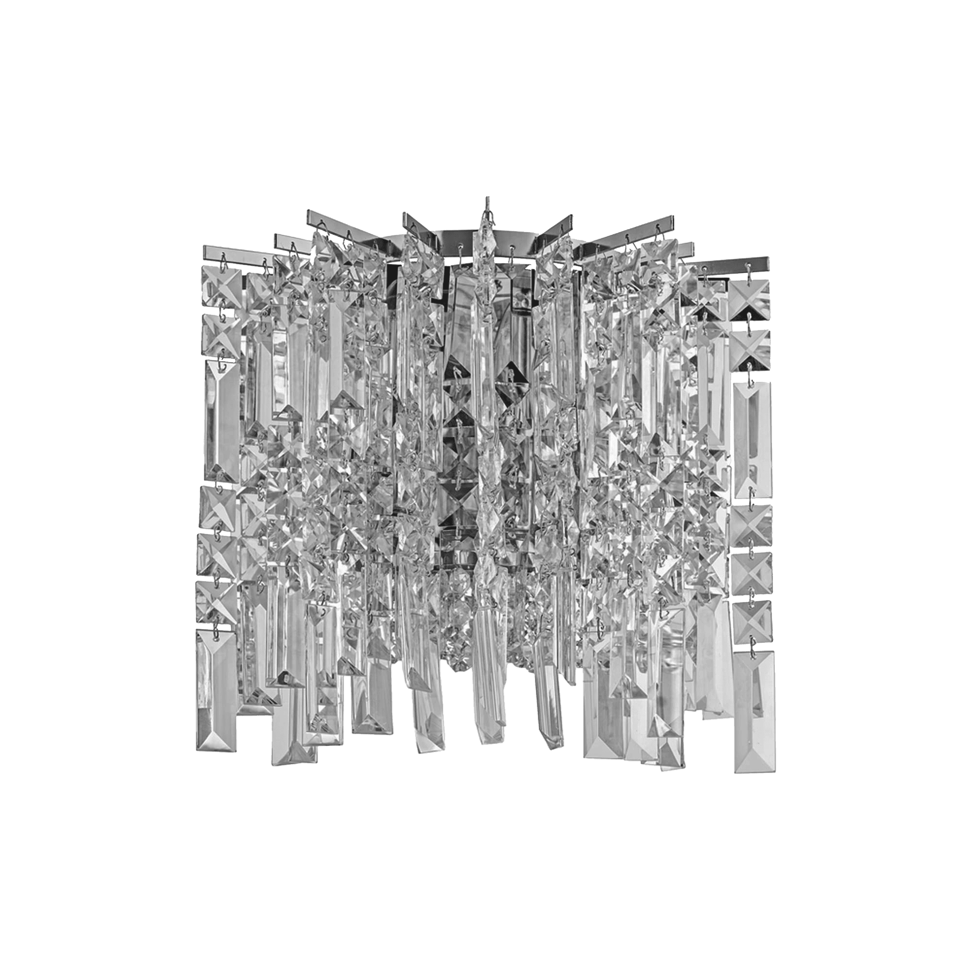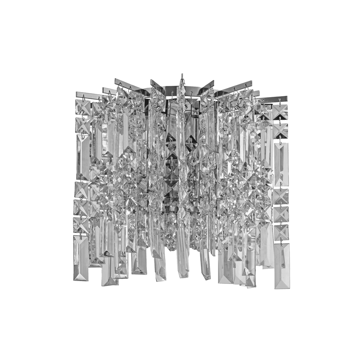 Визуальный эффект: Разная длина свисающих призм создает неровный, рваный нижний край, что придает светильнику динамику и напоминает сверкающий водопад или сталактиты в пещере. При включении света такое бра будет давать множество бликов и радужных отражений.