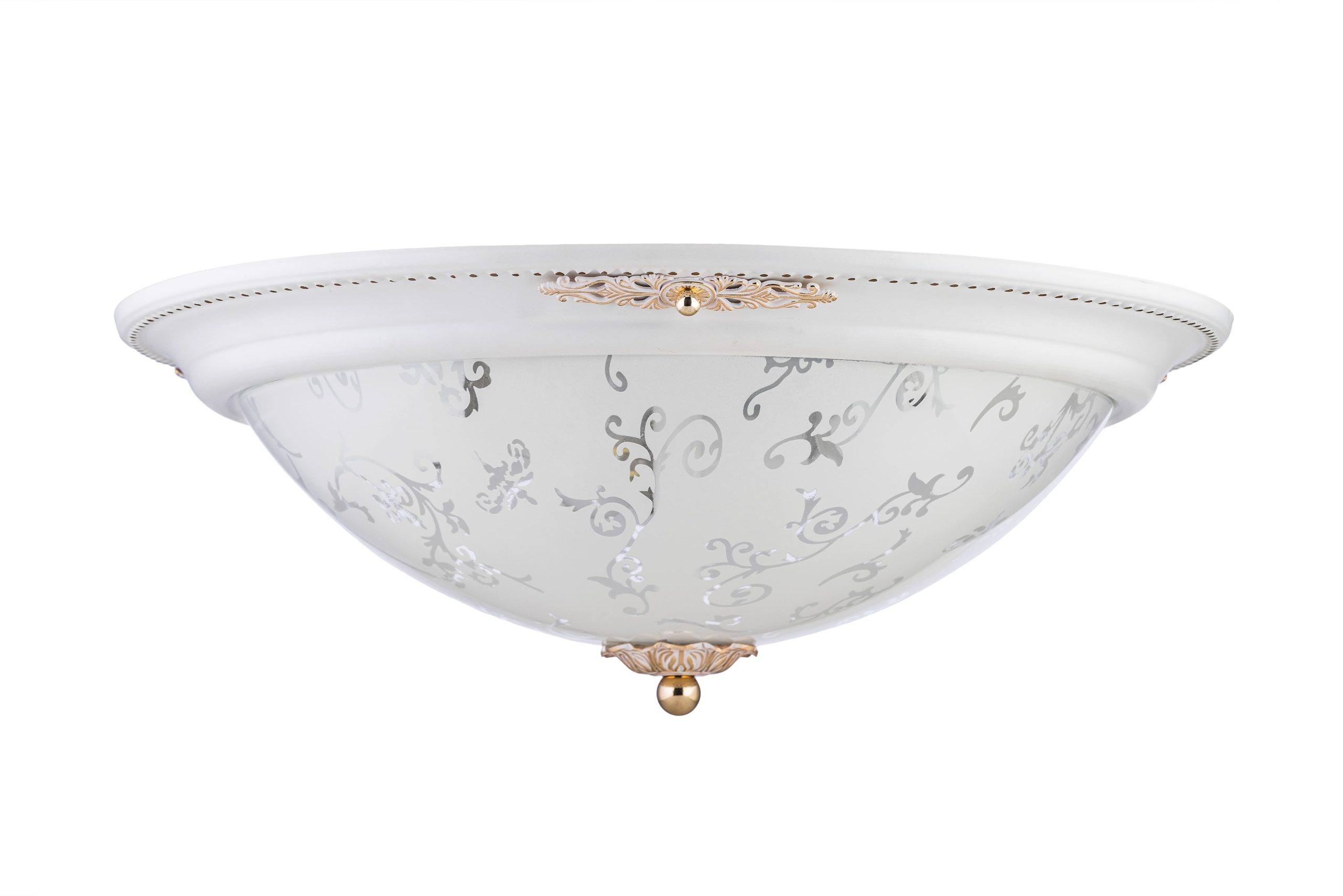 • Материалы: Основа и декоративные элементы, вероятно, изготовлены из металла, окрашенного в белый цвет. Плафон – из матового стекла с нанесенным узором.
