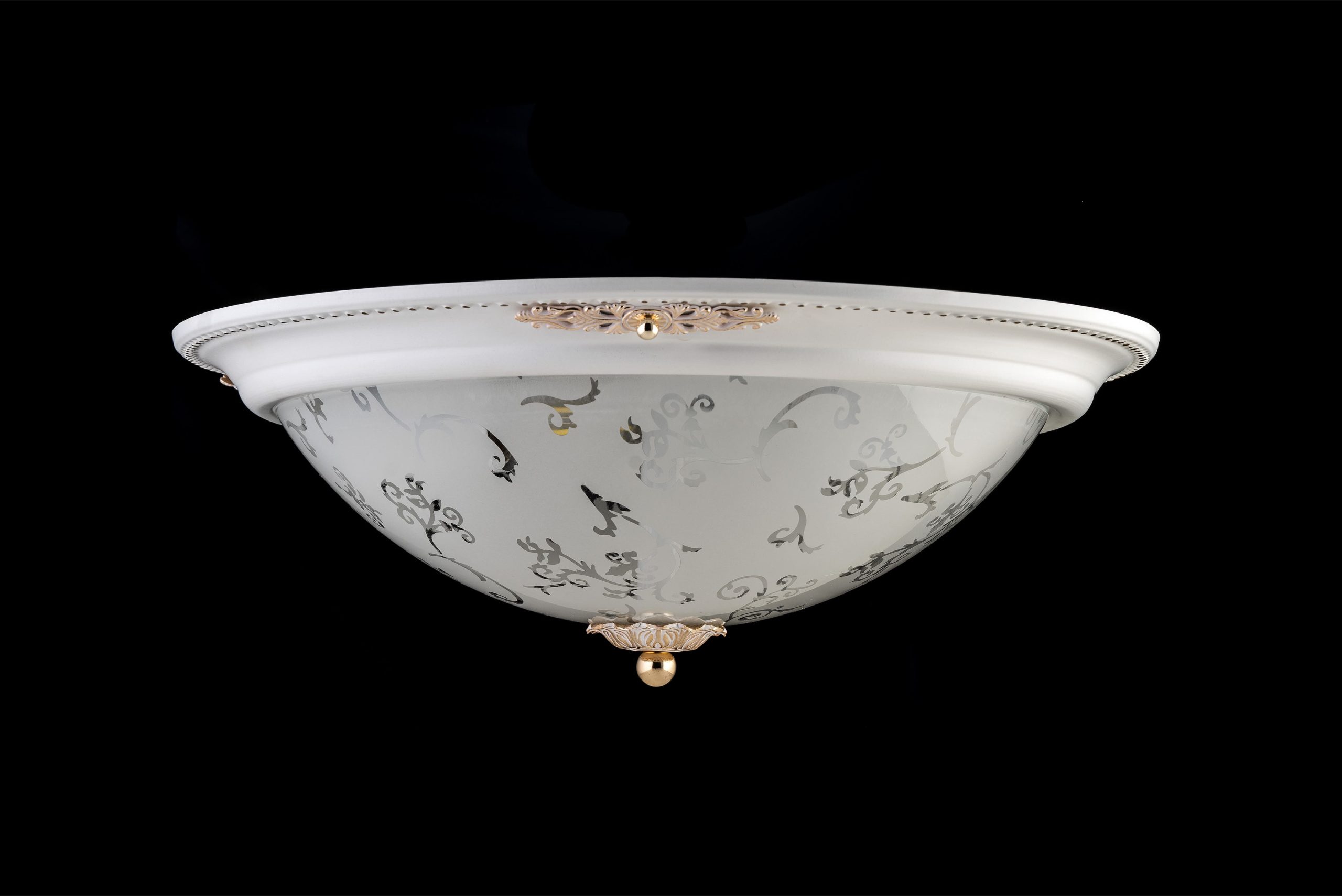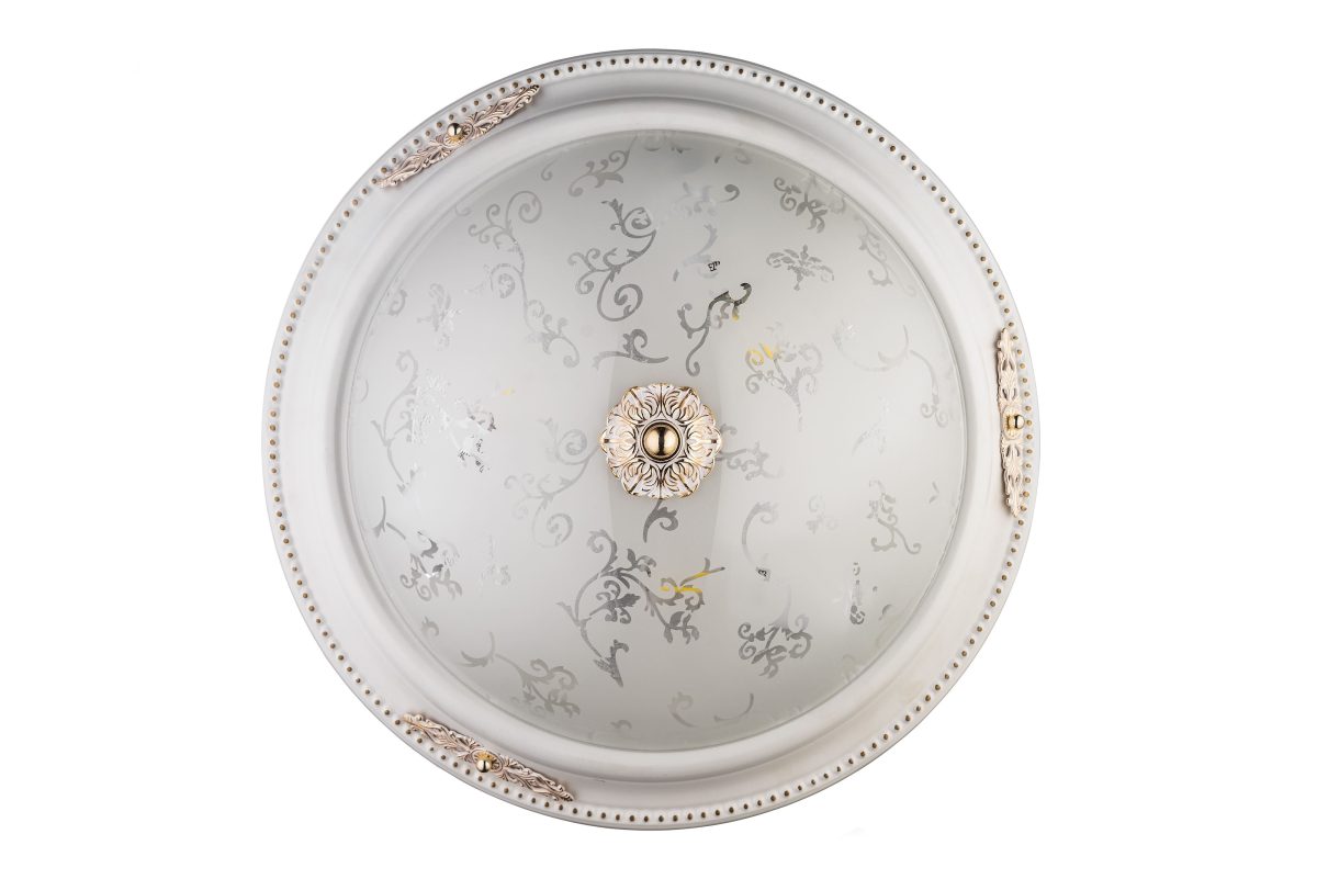 • Цветовая гамма: Основной цвет светильника – белый, что придает ему свежесть и воздушность. Декоративные элементы выполнены в более светлых тонах, возможно, с легким серебристым или пастельным оттенком, чтобы подчеркнуть их рельефность, но при этом сохранить общую светлую палитру. Узор на плафоне выполнен в серебристых или светло-серых тонах. Центральный элемент имеет золотистый оттенок.