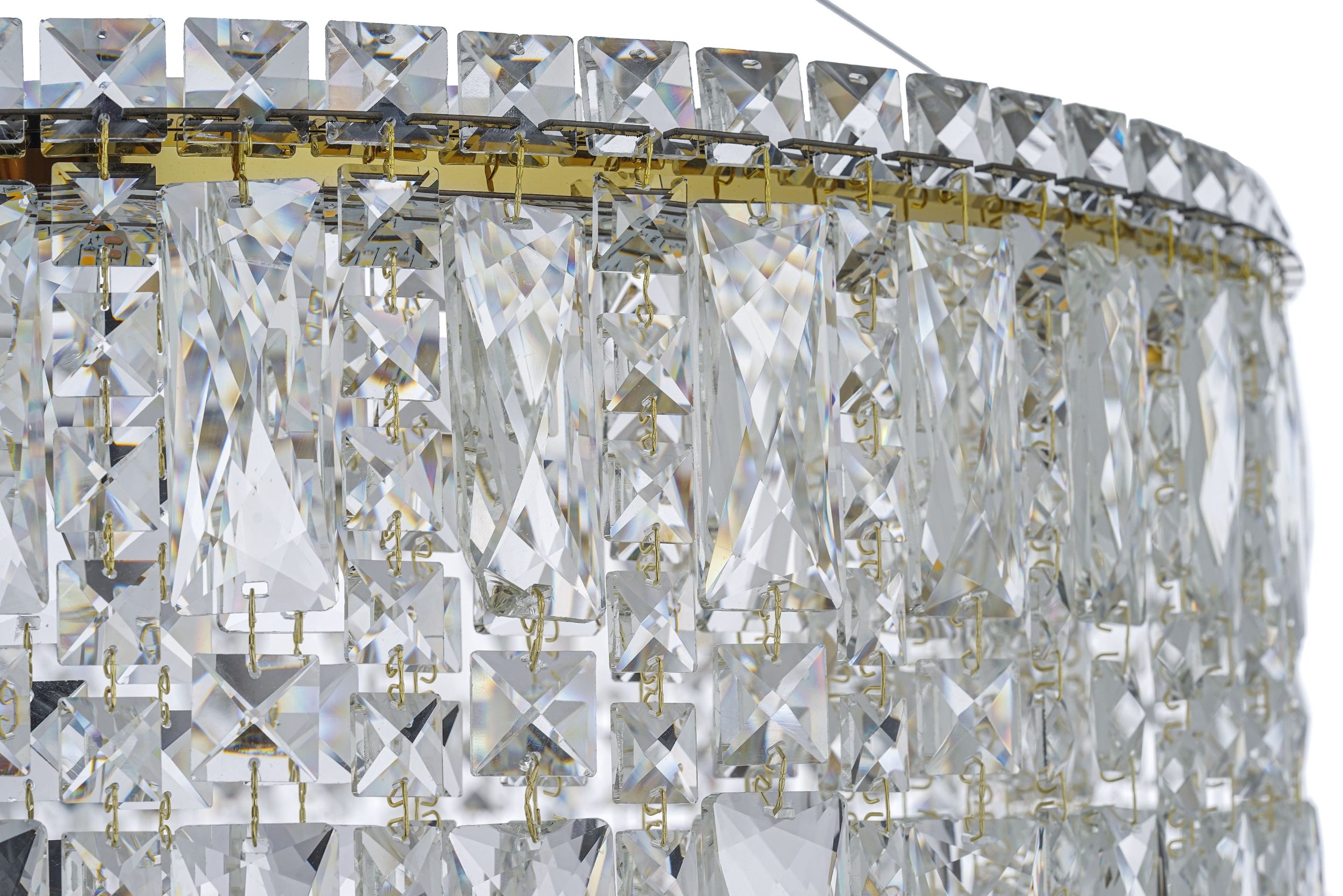 2. Материалы: Использование металлического каркаса с золотой отделкой и хрустальными элементов придает люстре элегантный и роскошный вид, что свойственно стилю Арт-деко.