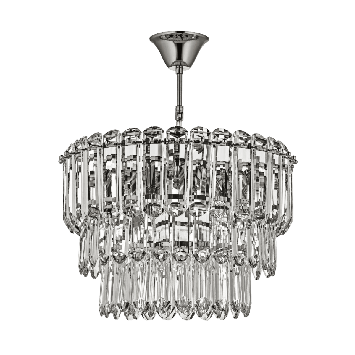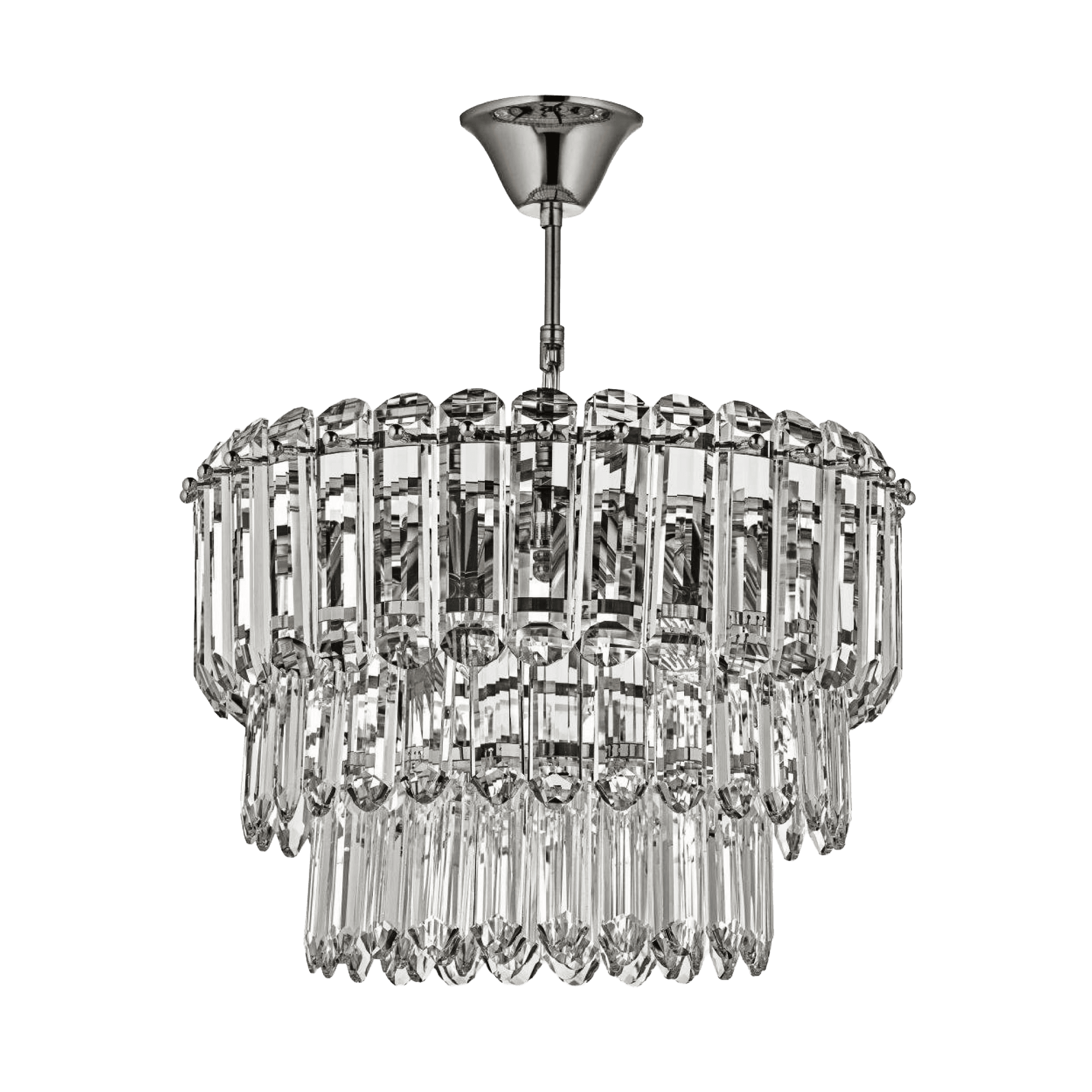 Olivetta E 1.5.40.100 N- Это хрустальная люстра барабанного типа с металлической фурнитурой никелевого цвета.