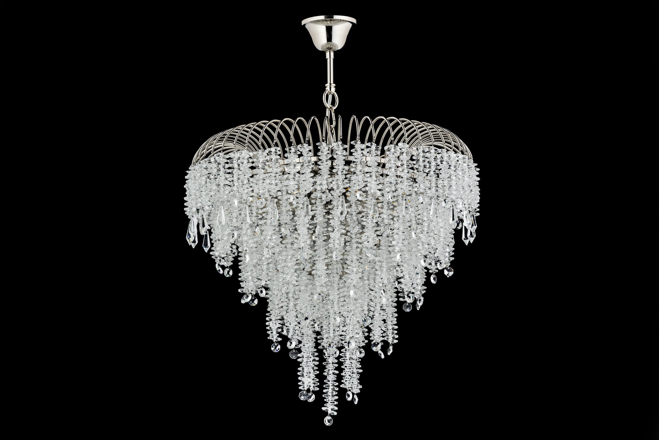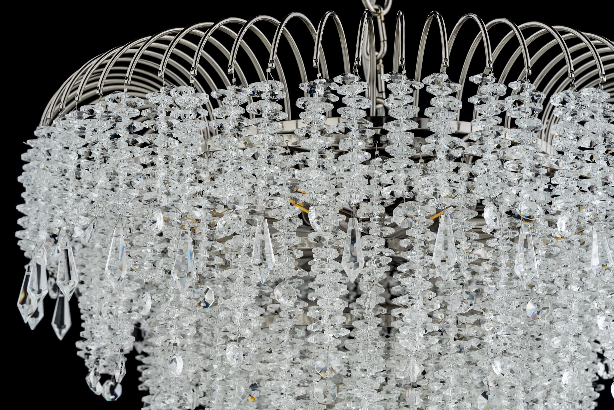 • Металлический каркас: Основной каркас люстры выполнен из металла никелевого цвета. Он имеет полированную, глянцевую поверхность, что придает ему сияющий и роскошный вид. Верхняя часть каркаса состоит из множества изогнутых, полукруглых металлических прутьев или дуг, расположенных по кругу, создавая форму, напоминающую перевернутую корзину или открытый купол.