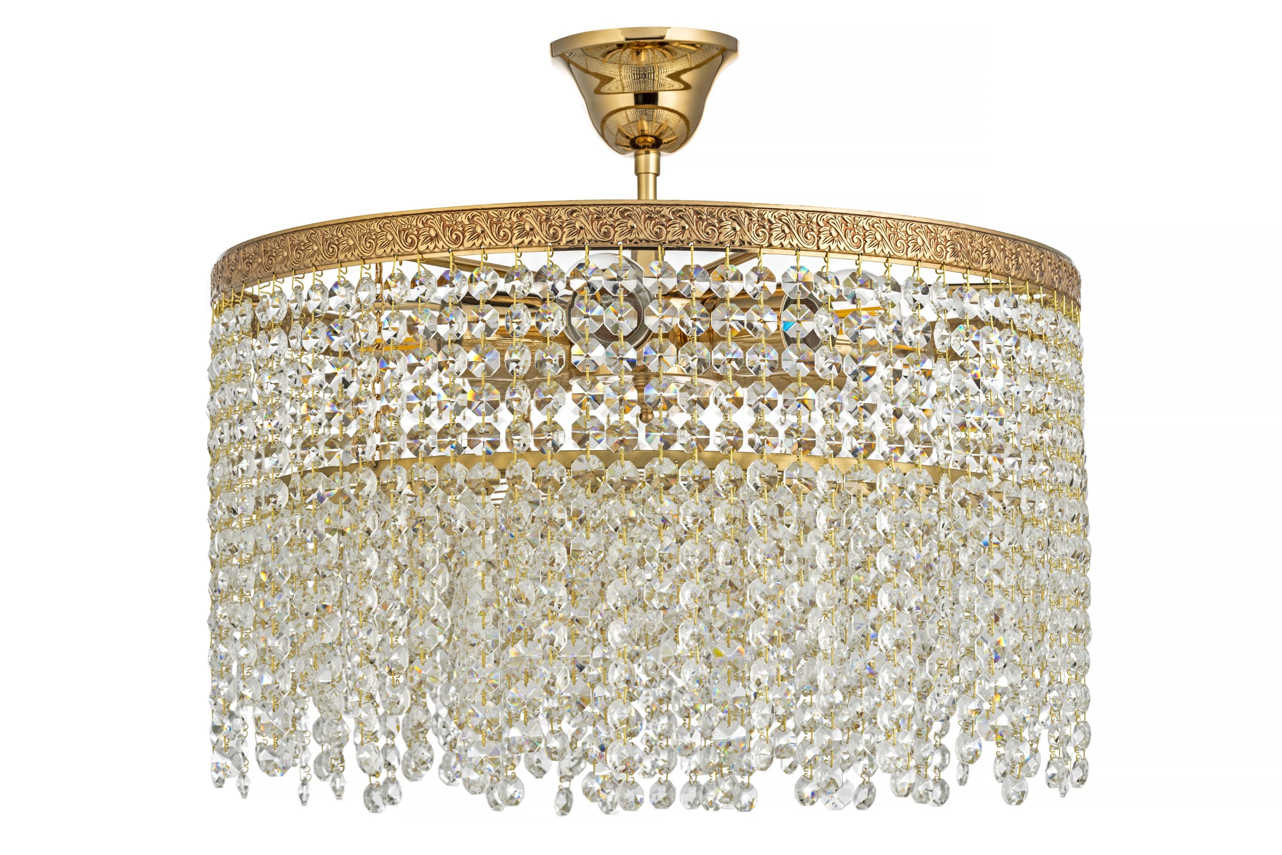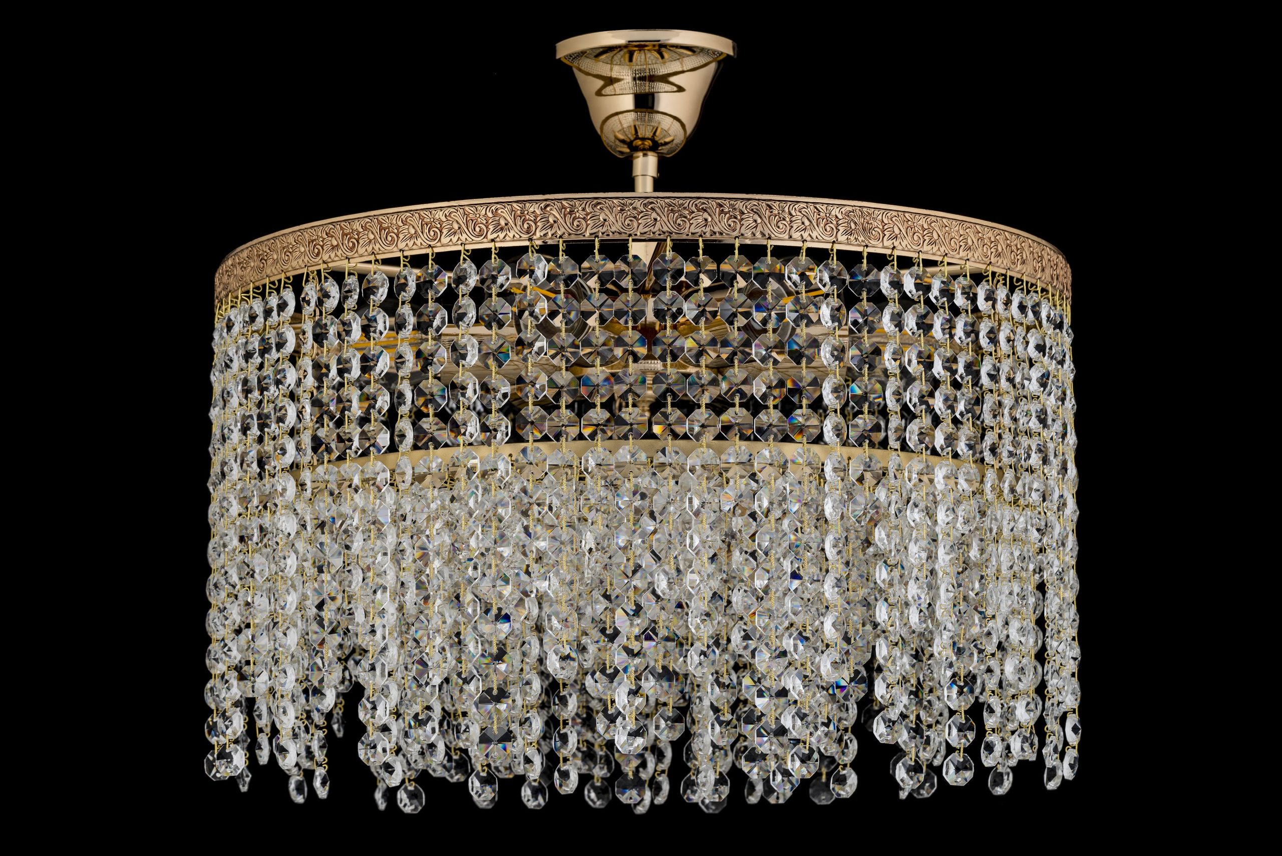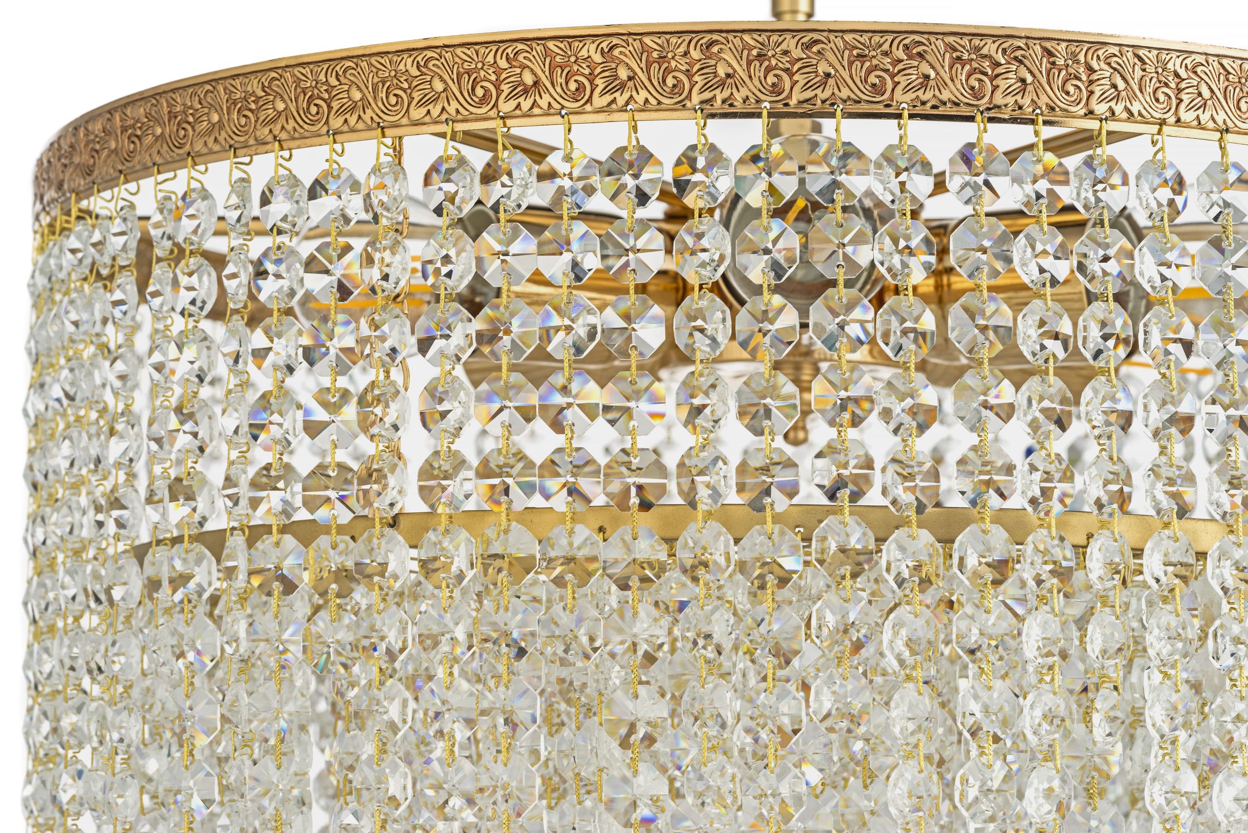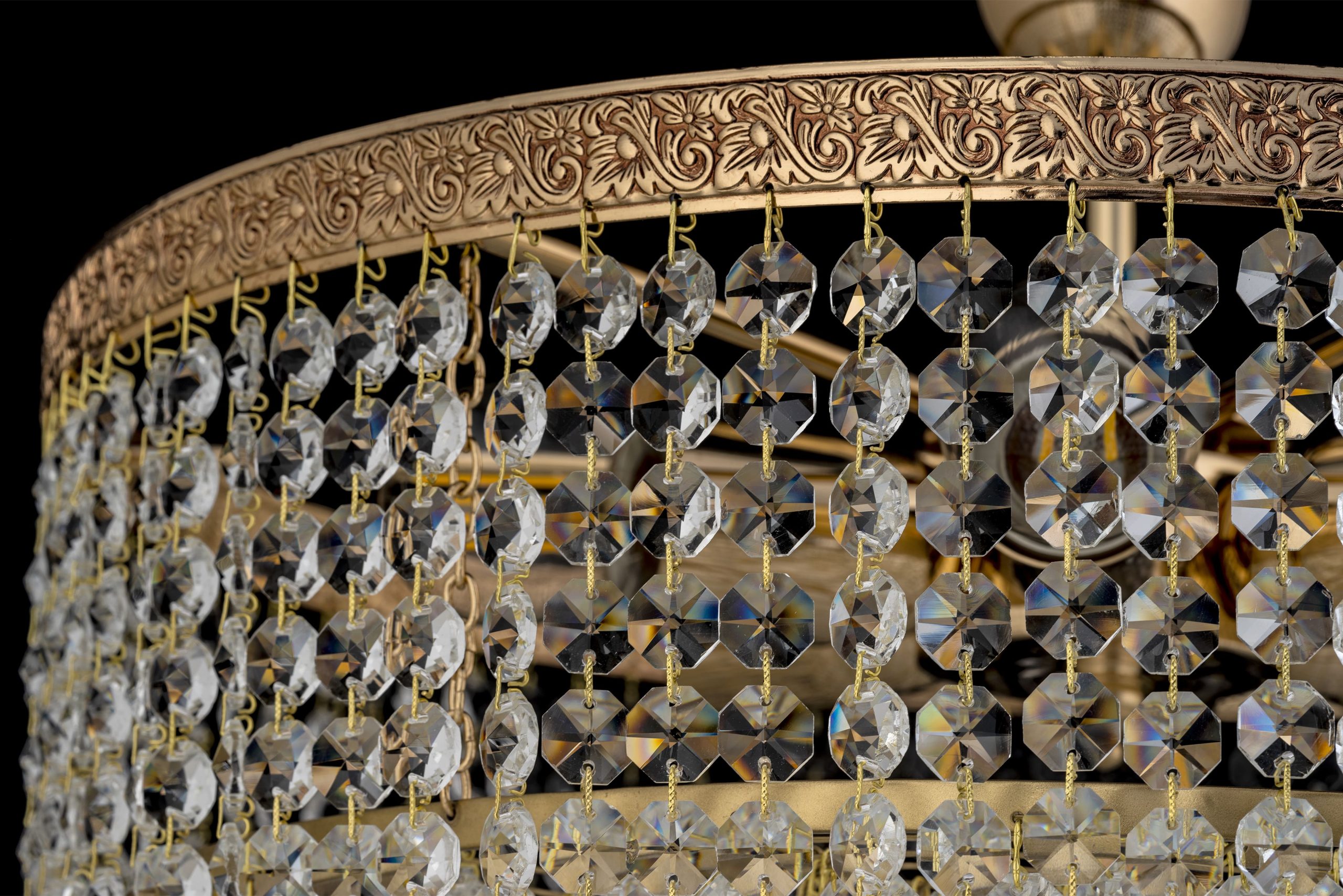 • Хрустальные элементы: Люстра обильно декорирована прозрачными, многогранными хрустальными подвесками. Они организованы в несколько плотных горизонтальных рядов, ниспадающих вниз, создавая эффект “хрустального водопада” или “занавеса”. Каждый ряд состоит из многочисленных фацетных кристаллов, которые улавливают и преломляют свет, создавая множество радужных бликов и искр. Некоторые кристаллы внизу могут быть слегка каплевидной формы. Кристаллы подвешены на тонких золотистых соединителях, которые гармонируют с цветом каркаса.