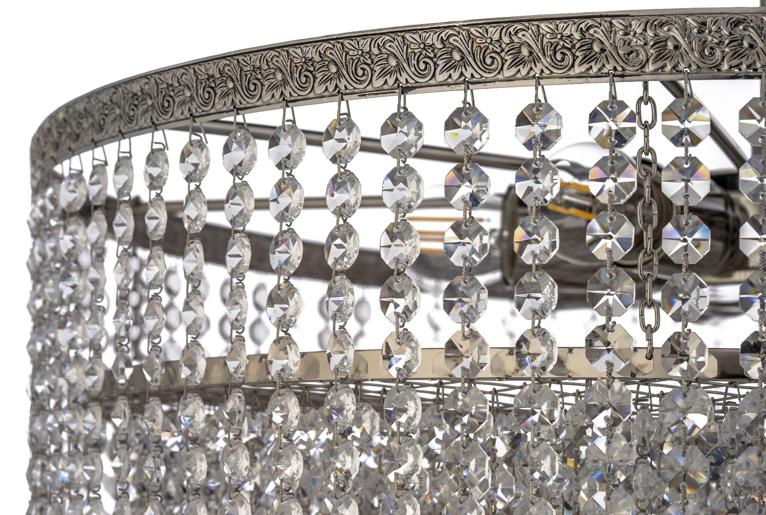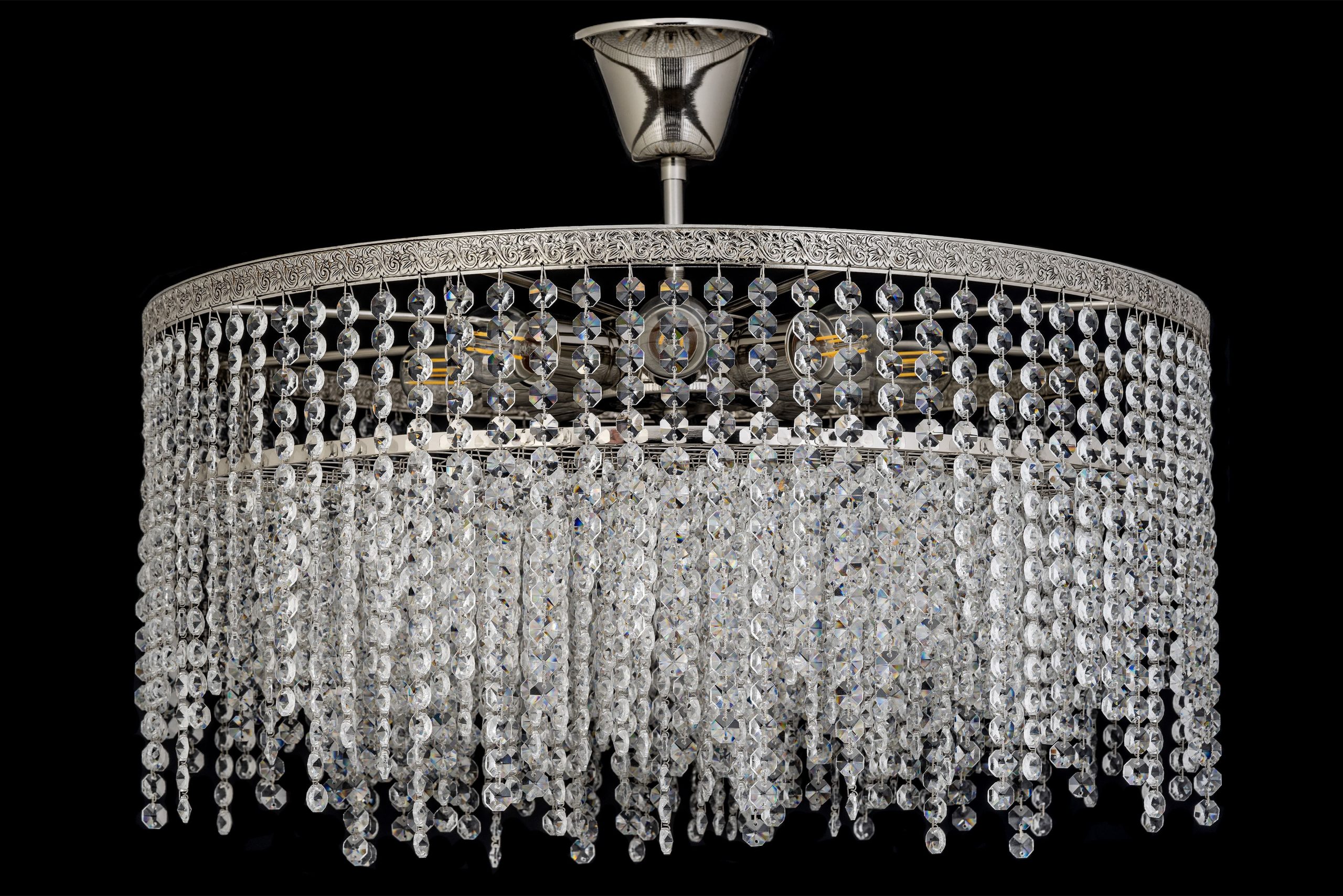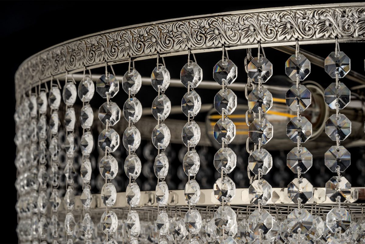 • Хрустальные элементы: Люстра обильно декорирована прозрачными, многогранными хрустальными подвесками. Они организованы в плотные горизонтальные ряды, образуя пышный “занавес” или “водопад” кристаллов, полностью скрывающий источники света. Каждый ряд состоит из многочисленных фацетных кристаллов (предположительно, октагональной или круглой формы), которые соединены между собой короткими цепочками или кольцами. Кристаллы улавливают и преломляют свет, создавая множество радужных бликов и искр, особенно в нижней части, где они свисают свободно.