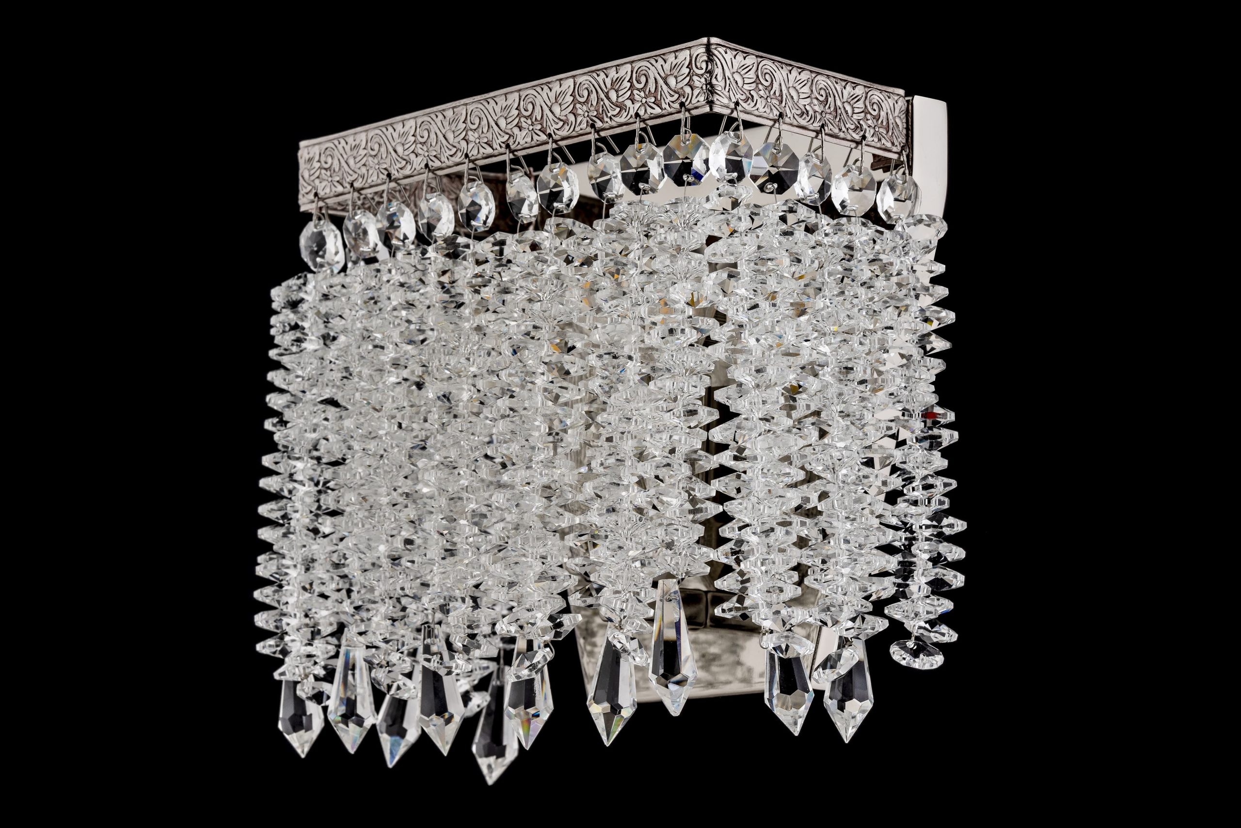 • Общее впечатление: Это бра создает впечатление изысканности и роскоши, но с более сдержанным, благородным шармом по сравнению с золотистым вариантом. Сочетание детального классического орнамента, “состаренного” серебристого металла и обилия сияющего хрусталя делает его идеальным для интерьеров в классическом, неоклассическом, винтажном, шебби-шик или даже современном гламурном стиле, где требуется добавить элегантности, мягкого блеска и утонченной атмосферы.