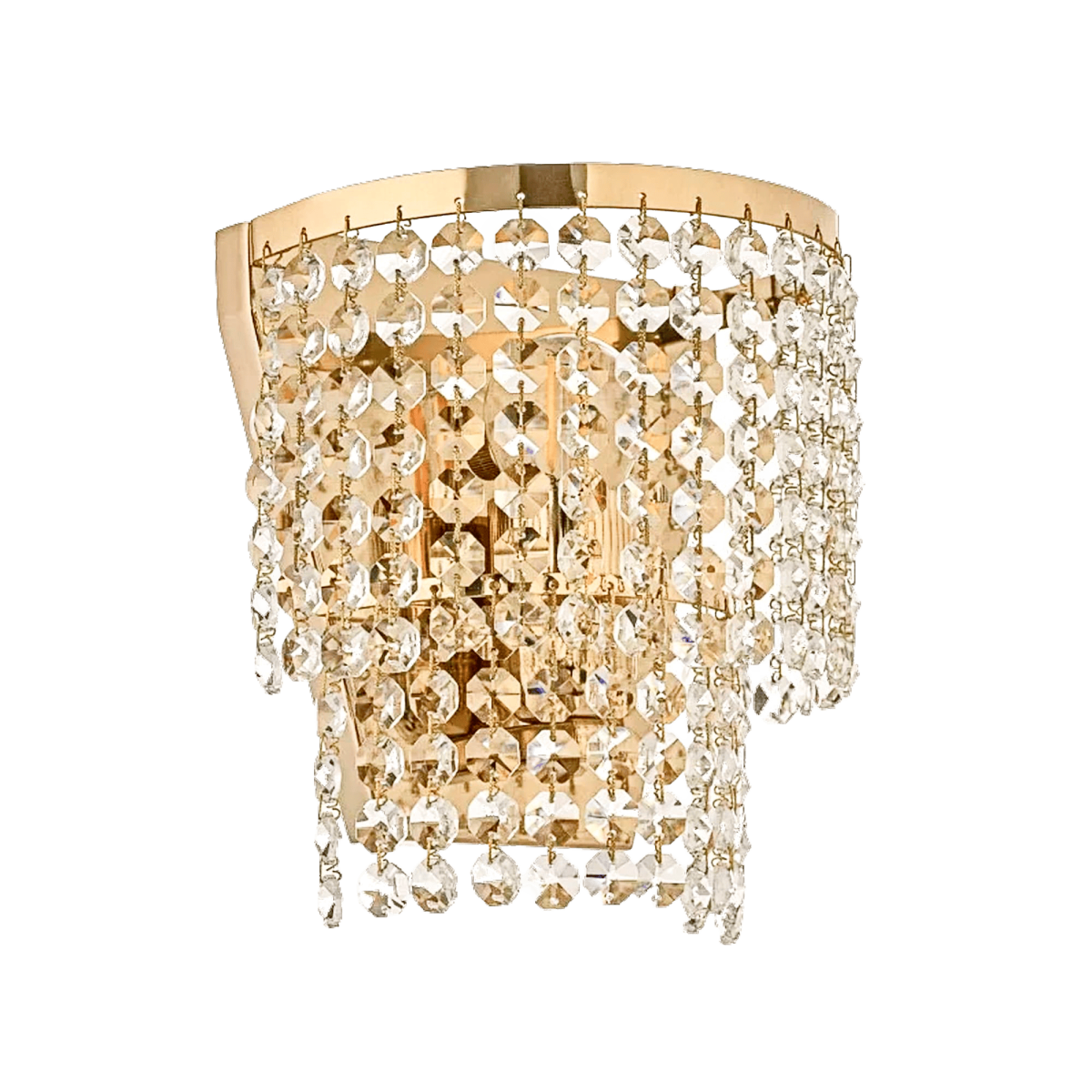 Конструкция: Бра имеет изогнутое, полукруглое основание, которое крепится к стене. От него вниз спускаются частые ряды хрустальных подвесок.