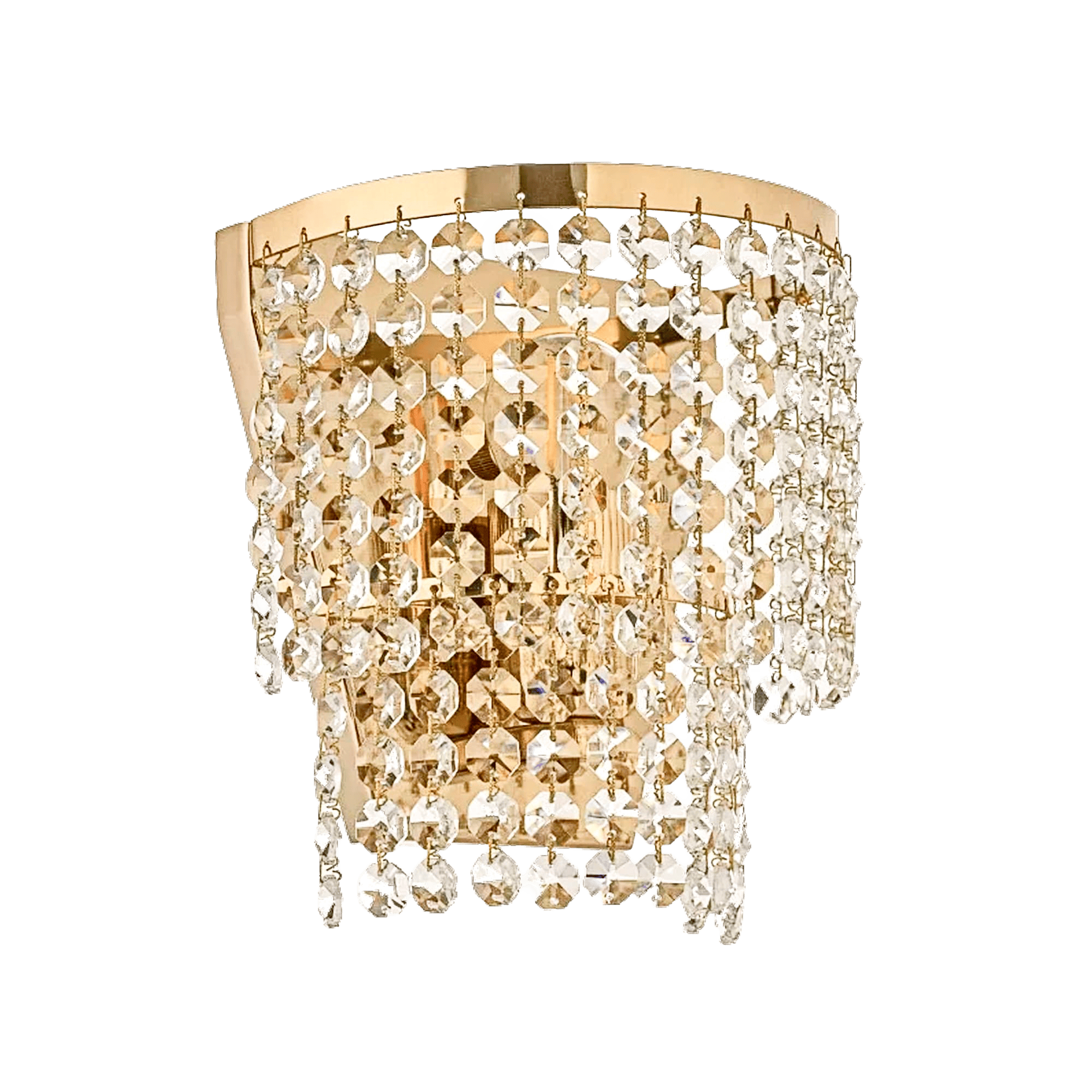 Материалы и цвет: Основание выполнено из металла золотого цвета с глянцевым блеском. Декоративную часть составляют многочисленные подвески из прозрачного граненого хрусталя.