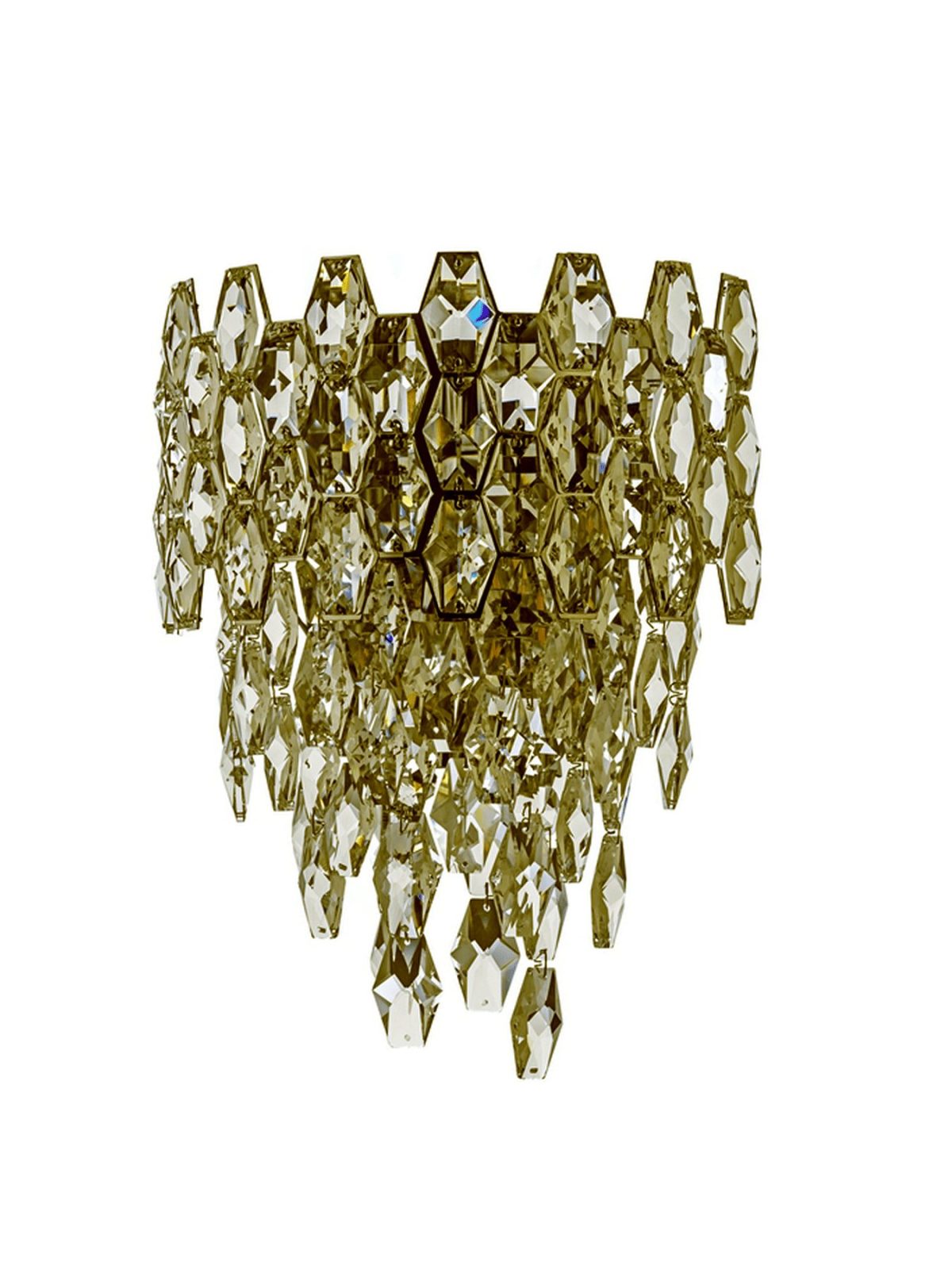 • Нижняя часть: Представляет собой «ниспадающий водопад» из подвесок разной длины. Кристаллы здесь имеют заостренную, ромбовидную или каплевидную форму, что создает динамичный и легкий визуальный эффект.
