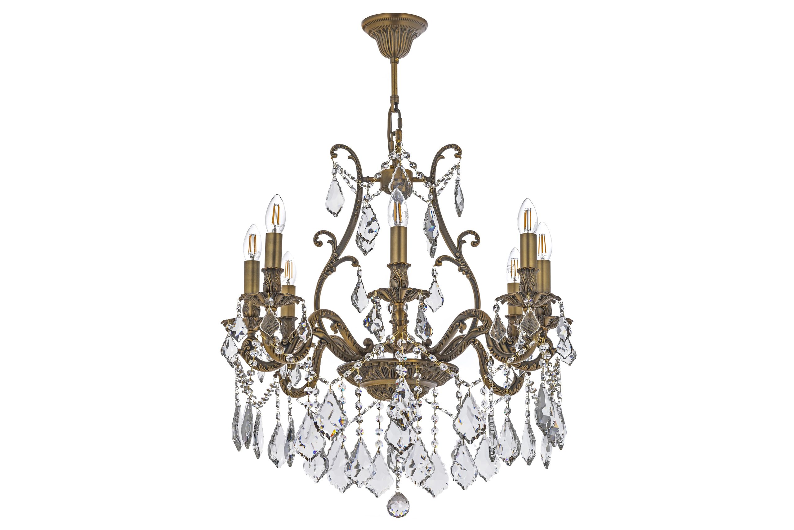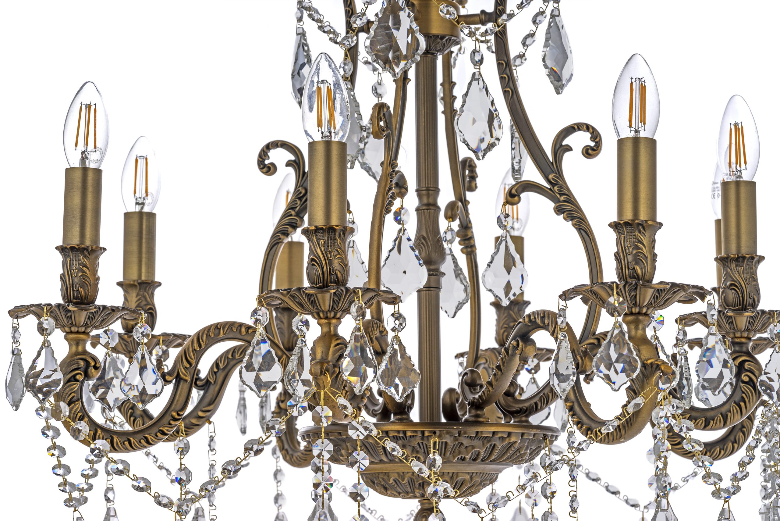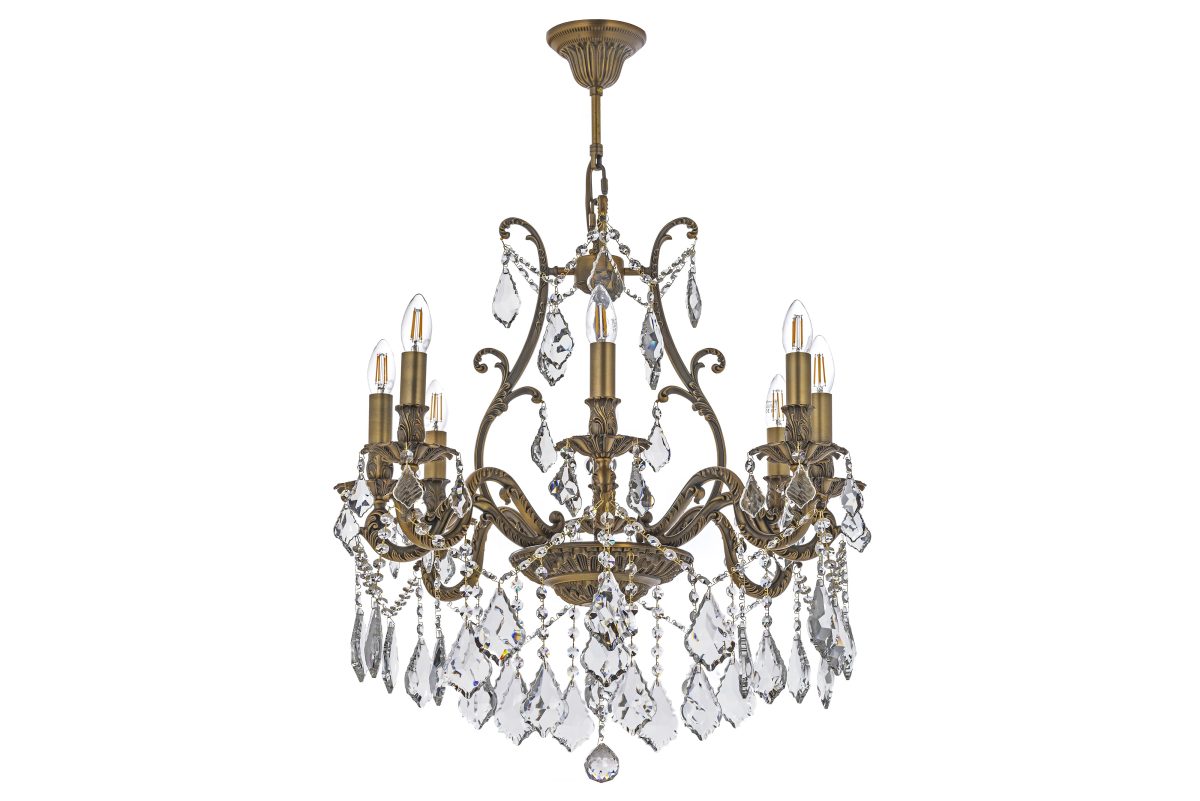 • Материал и отделка: Основной каркас и рожки люстры изготовлены из металла с отделкой под старинную бронзу или античную латунь, что придает ей благородный и состаренный вид. Поверхность металла украшена изящными резными узорами, витыми элементами и растительными мотивами, характерными для классического декора.