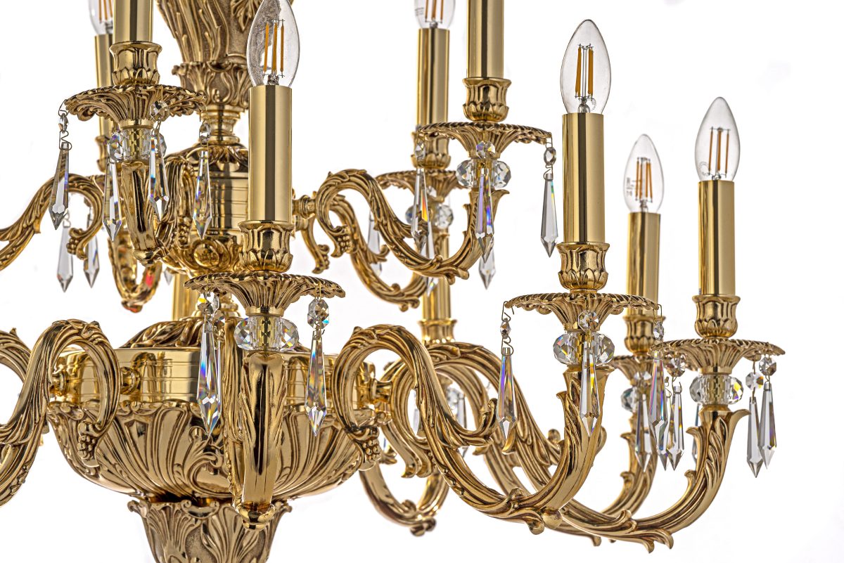 • Конструкция: Она имеет традиционную многоярусную конструкцию с изящно изогнутыми “руками” или “рожками”, на которых расположены лампы. Центральная часть люстры богато декорирована, демонстрируя сложные узоры и рельефные элементы, характерные для барокко и рококо, такие как завитки, растительные мотивы и орнаменты.