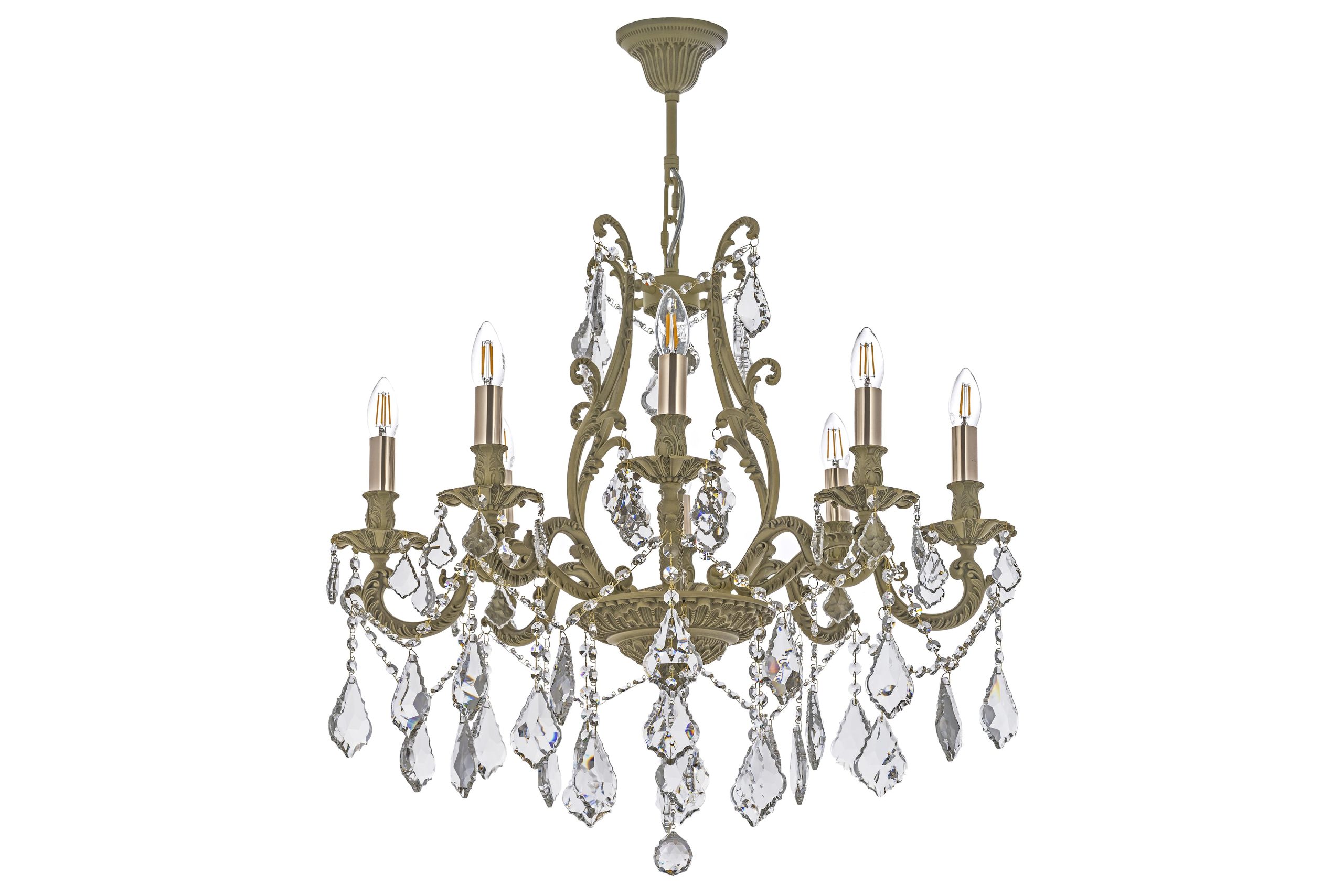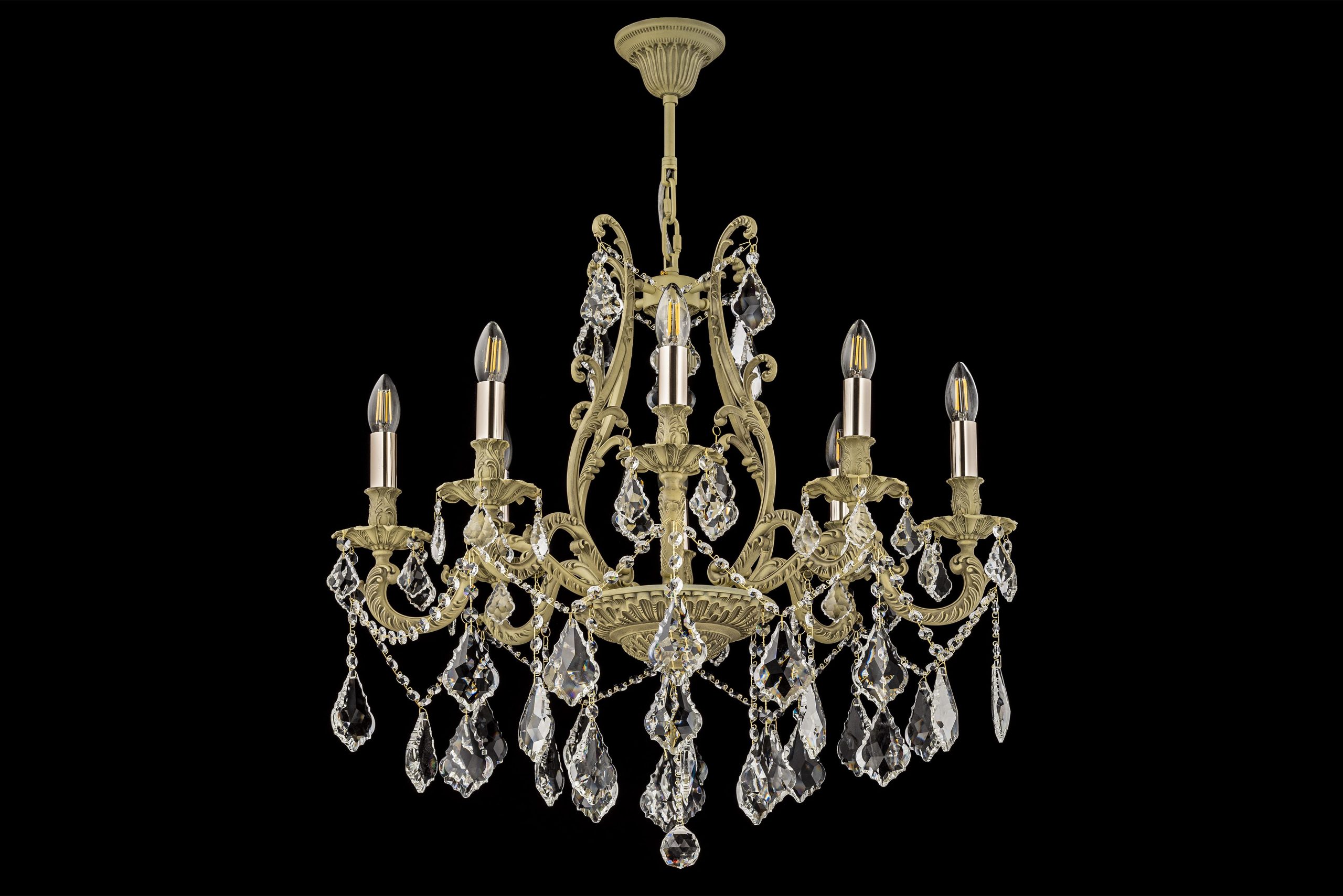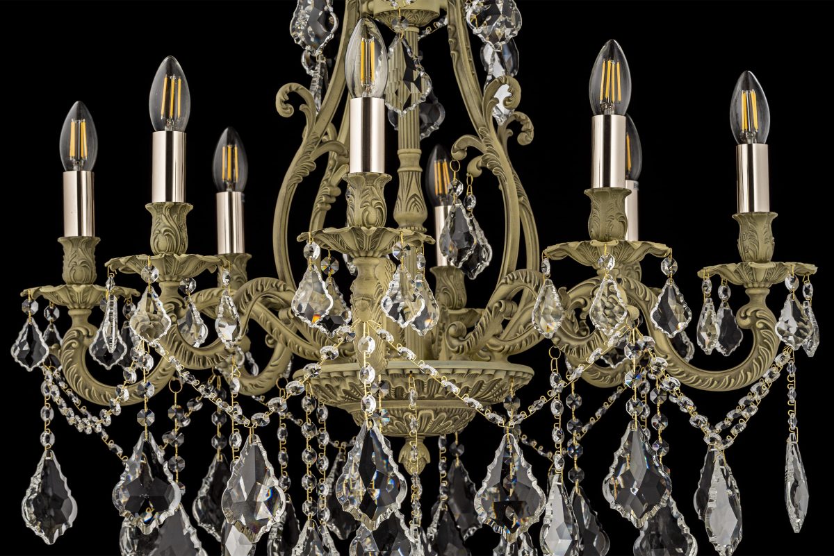 • Источники света: Источники света выполнены в виде ламп, имитирующих пламя свечей, что является классическим приемом для люстр такого стиля. Всего видно восемь таких ламп, расположенных на рожках, создавая равномерное и теплое освещение.