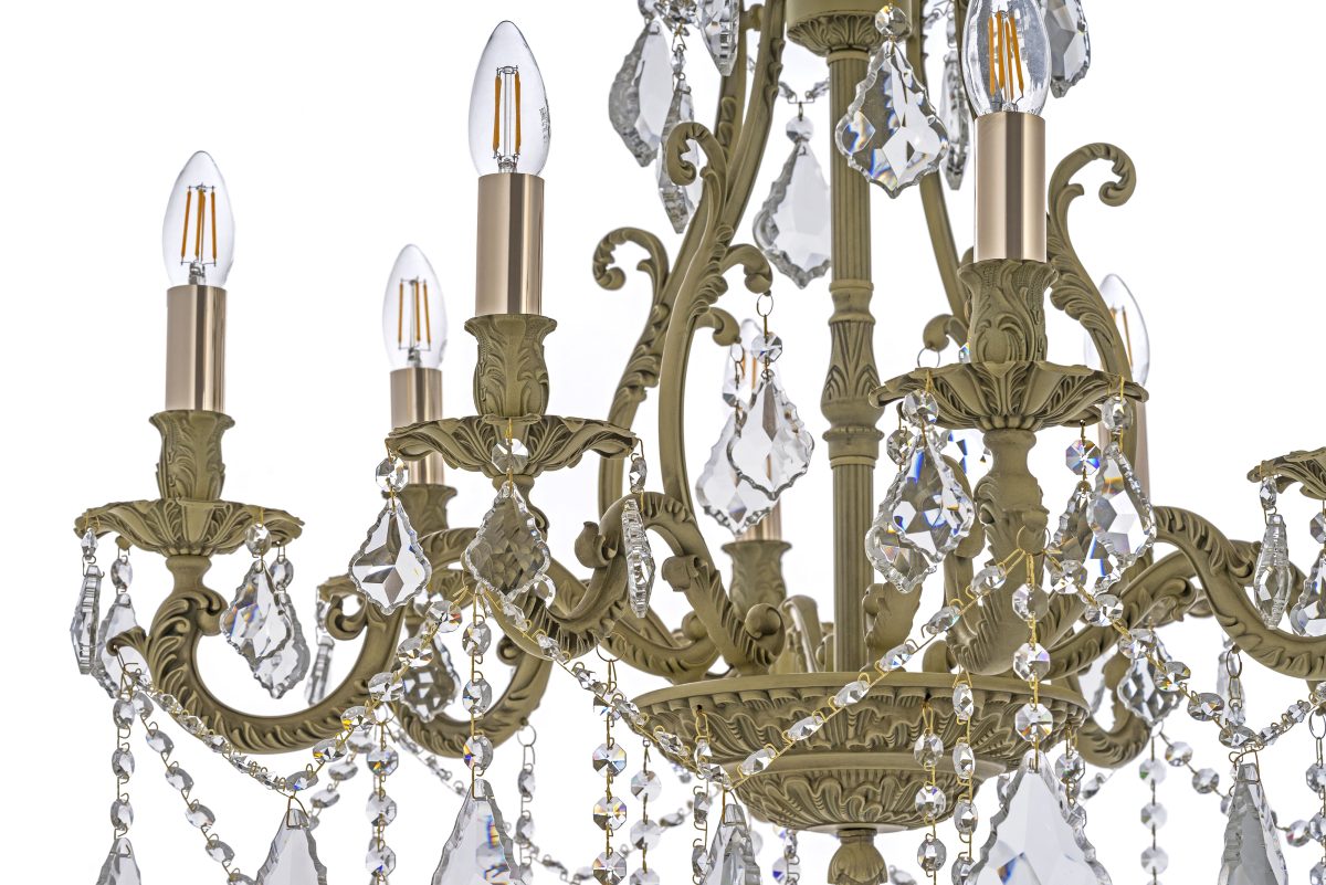 • Материал и отделка: Металлический каркас люстры кремового цвета с легким матовым эффектом. Это придает ей благородный и винтажный вид, в отличие от ярко-полированного золота. Поверхность металла украшена изящной резьбой, витыми элементами, пышными завитками и стилизованными растительными мотивами, характерными для дворцовых интерьеров.
