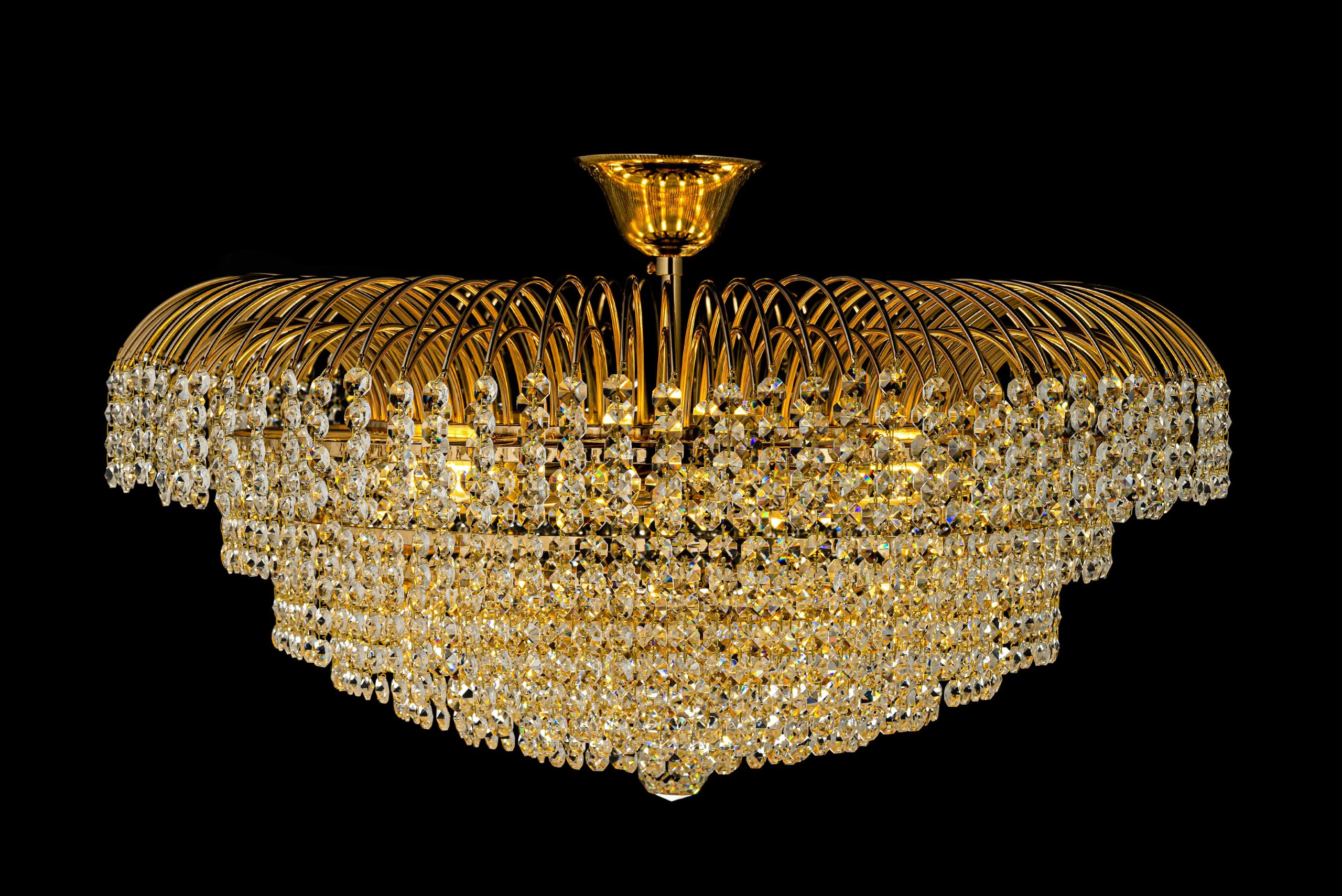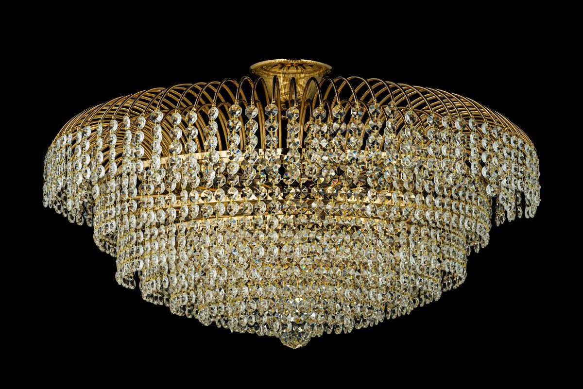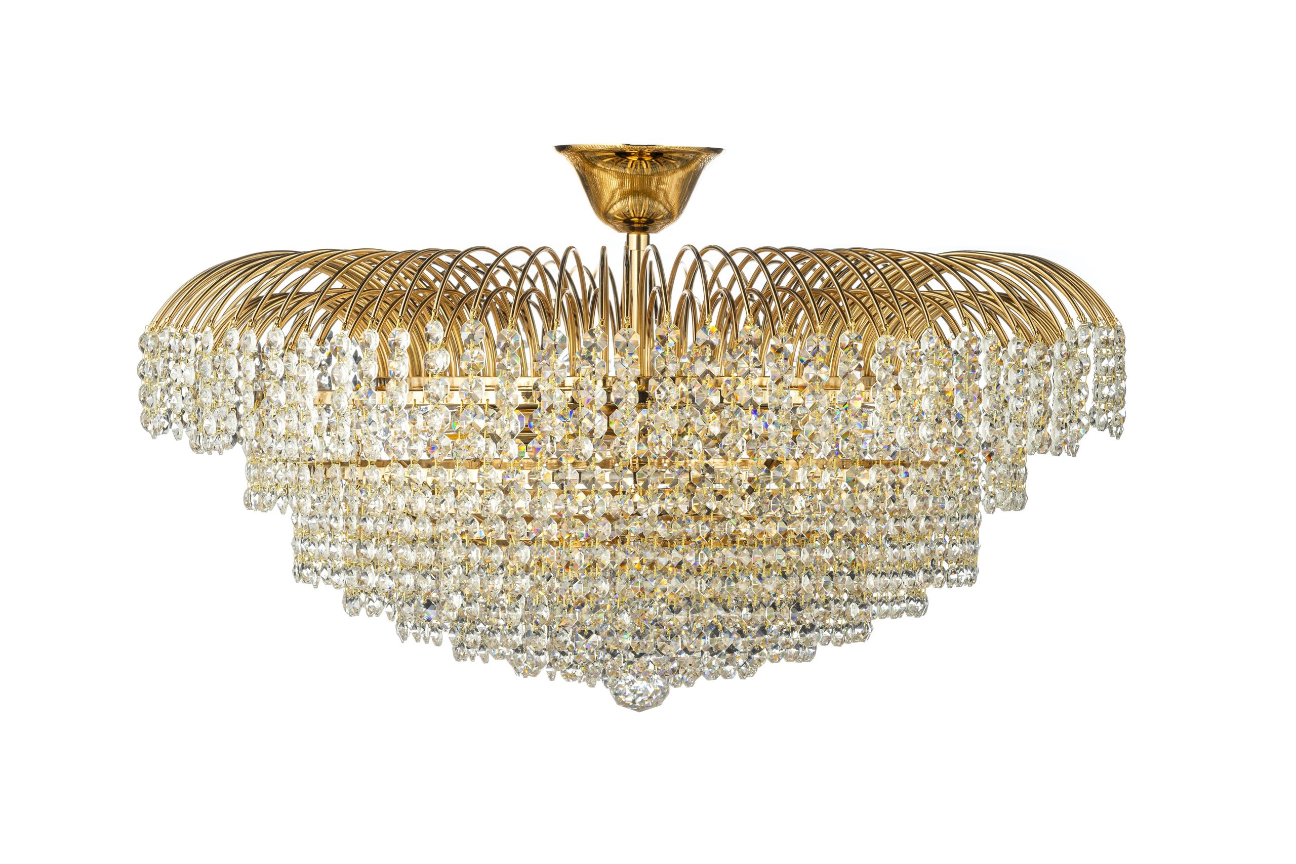 Люстра имеет многоярусную конструкцию, характерную для классических люстр. Основной каркас выполнен из металла, окрашенного в золотой цвет, что придает ей роскошный и элегантный вид. Каркас состоит из множества изогнутых металлических элементов, напоминающих арки или лепестки, которые создают объемную и пышную форму.