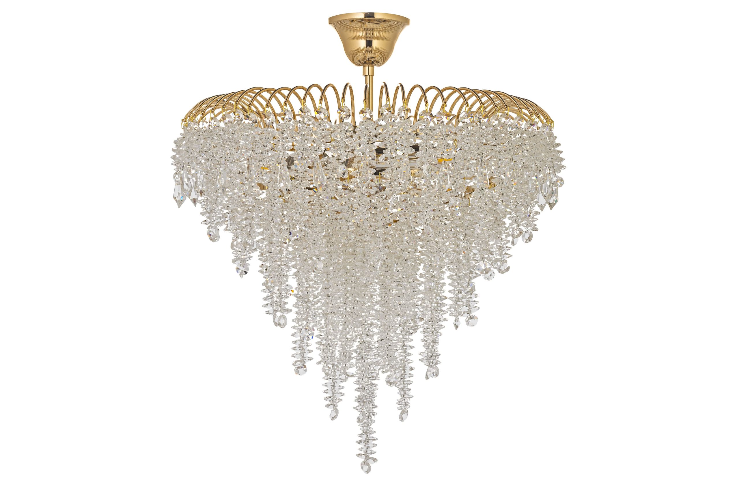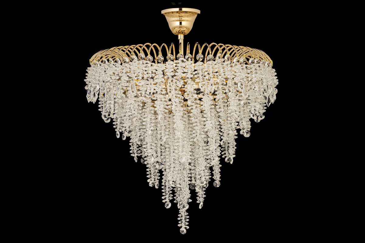 • Форма и конструкция: Люстра имеет выразительную каскадную, “водопадную” или “ампельную” форму, сужающуюся книзу. Она выглядит как плотное облако или занавес из кристаллов, ниспадающий из золотистого каркаса.