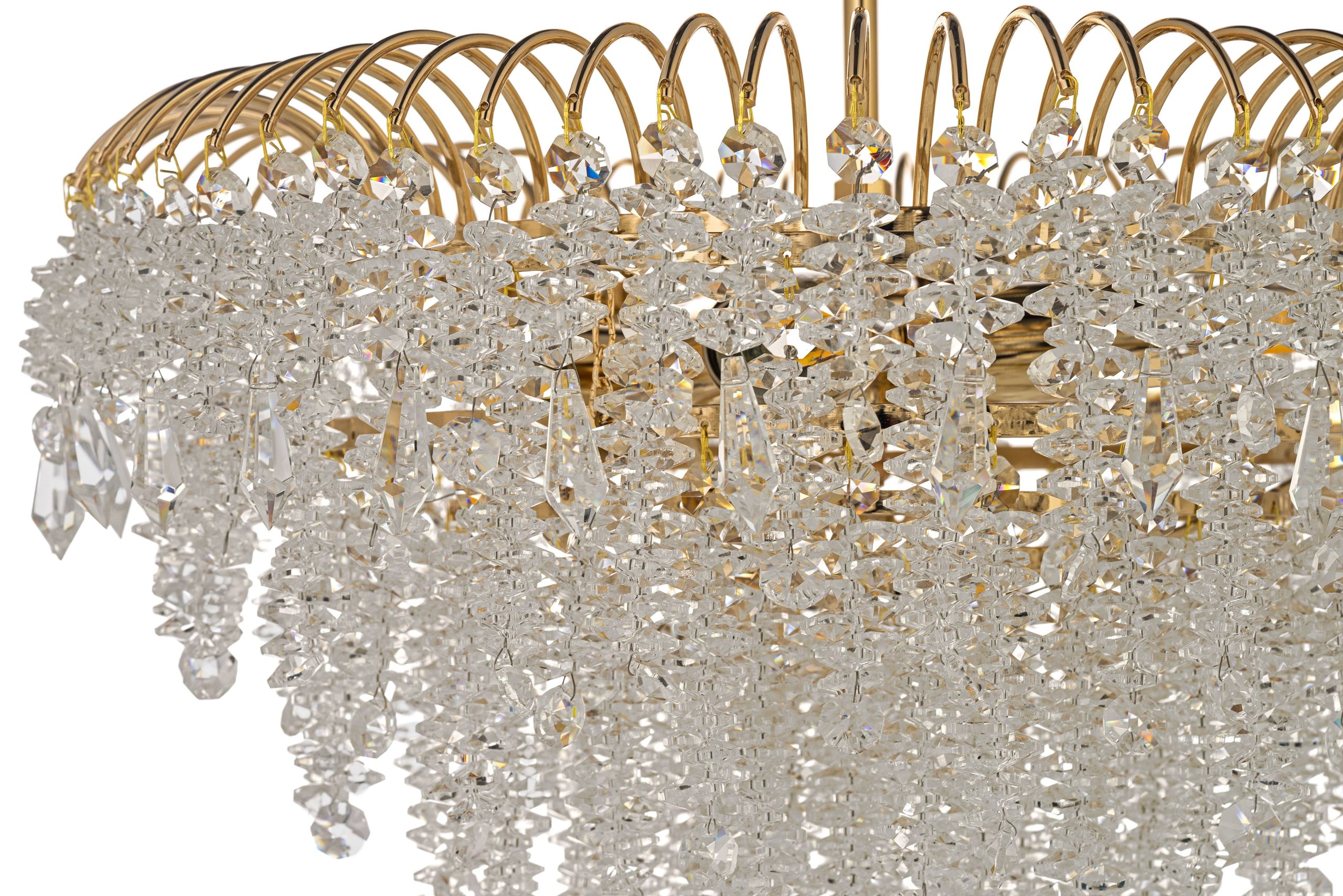 • Кристаллы: Люстра обильно украшена огромным количеством прозрачных, ограненных кристаллов. Эти кристаллы собраны в плотные, длинные нити (гирлянды), которые спускаются вниз, создавая эффект мерцающего, струящегося потока. Кристаллы имеют различные размеры и формы, включая мелкие бусины и более крупные, удлиненные подвески-призмы в нижней части каскада.