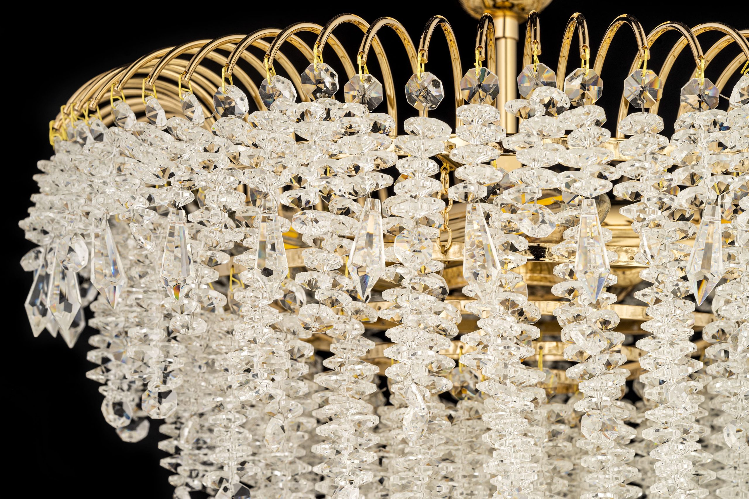 • Детализация: Многочисленные грани каждого кристалла максимально преломляют свет, создавая впечатляющую игру бликов, переливов и радужных отблесков по всему объему люстры. Плотность расположения кристаллов усиливает этот эффект, делая люстру очень яркой и заметной.