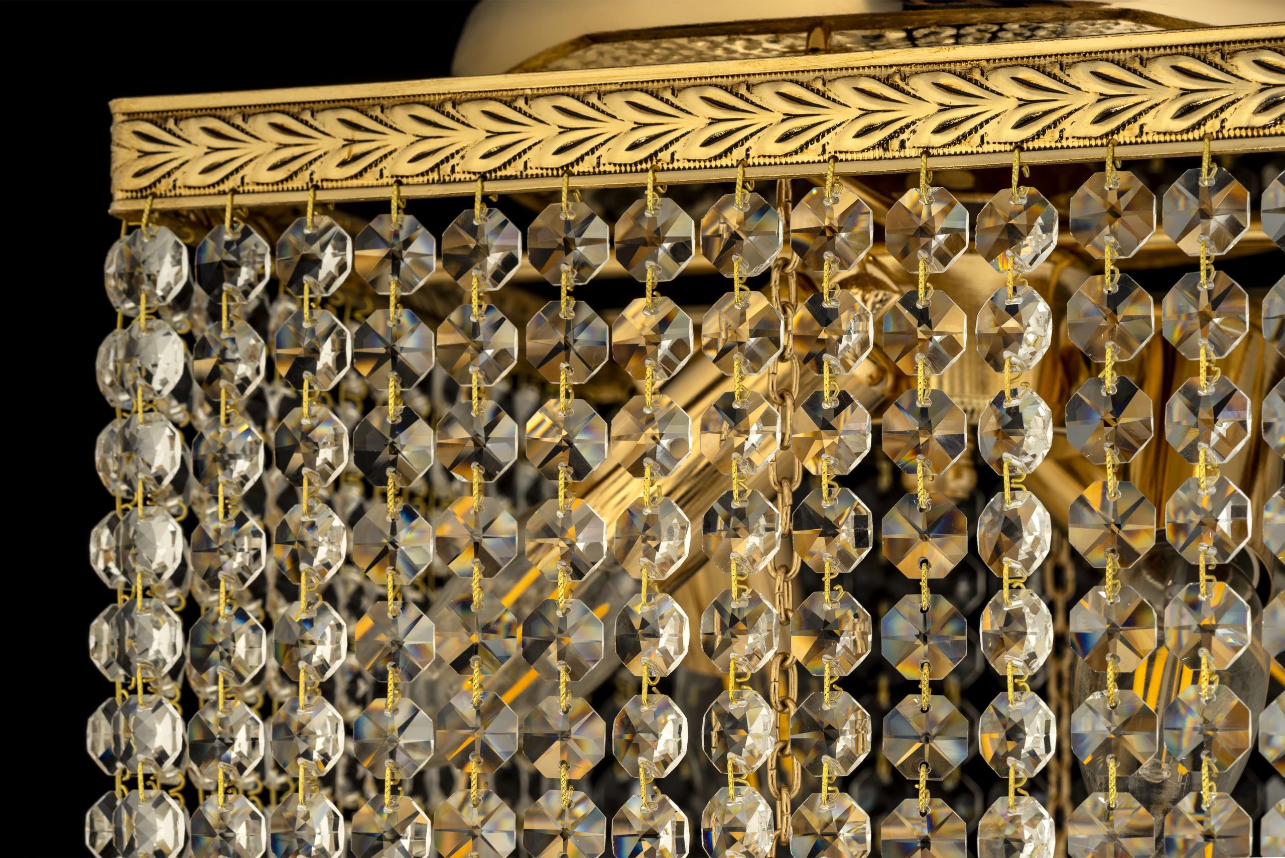 • Конструкция: Люстра имеет квадратное металлическое основание золотого (латунного) цвета. По периметру основания нанесен рельефный узор в виде лавровых листьев или античного орнамента.