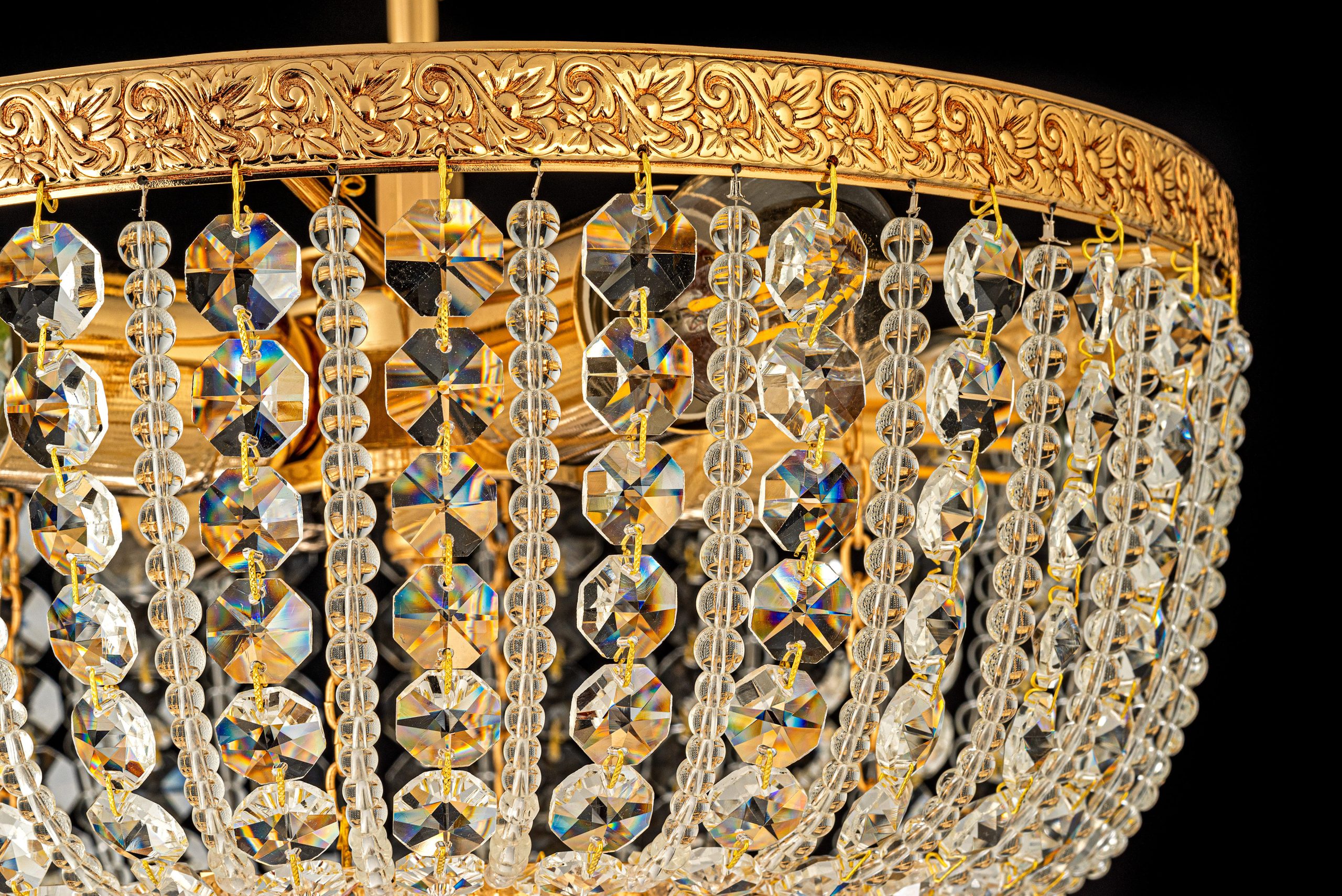 • Общее впечатление: Люстра выглядит очень торжественно, богато и изысканно. Обилие золотого цвета и сверкающего хрусталя создают эффект праздника и сияния, делая ее центральным элементом любого интерьера.