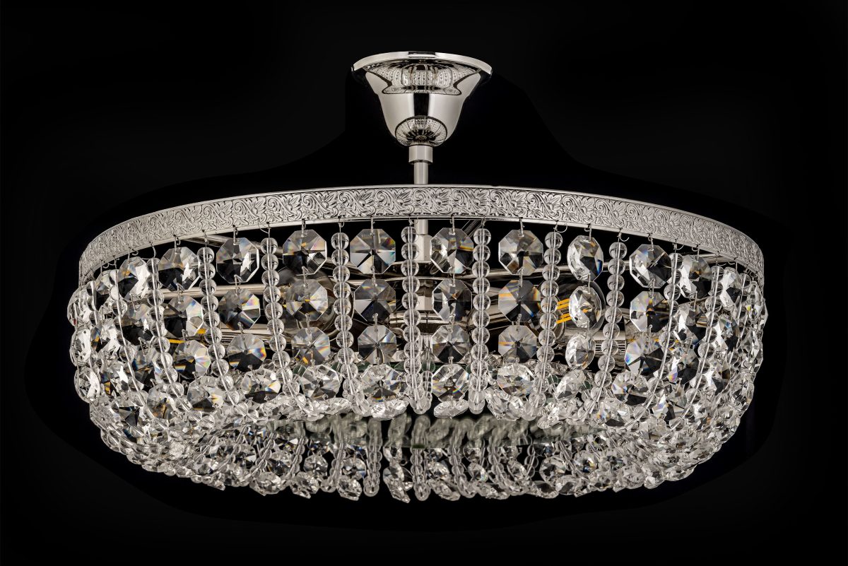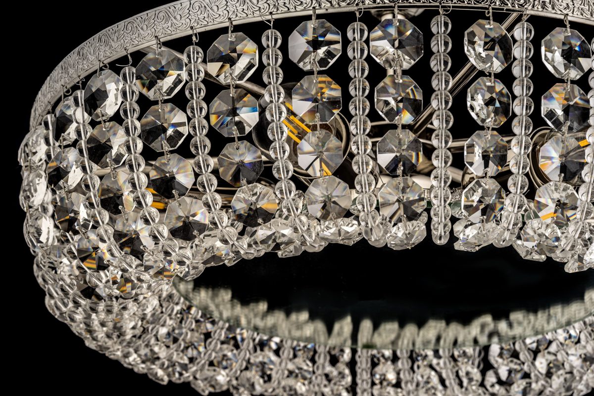• Форма и конструкция: Люстра имеет приземистую, широкую, круглую форму, предназначенную для крепления близко к потолку. От центральной потолочной чаши спускается короткий стержень, к которому крепится основной горизонтальный обод. Нижняя часть люстры формирует пышный полусферический или чашеобразный каскад из хрусталя.