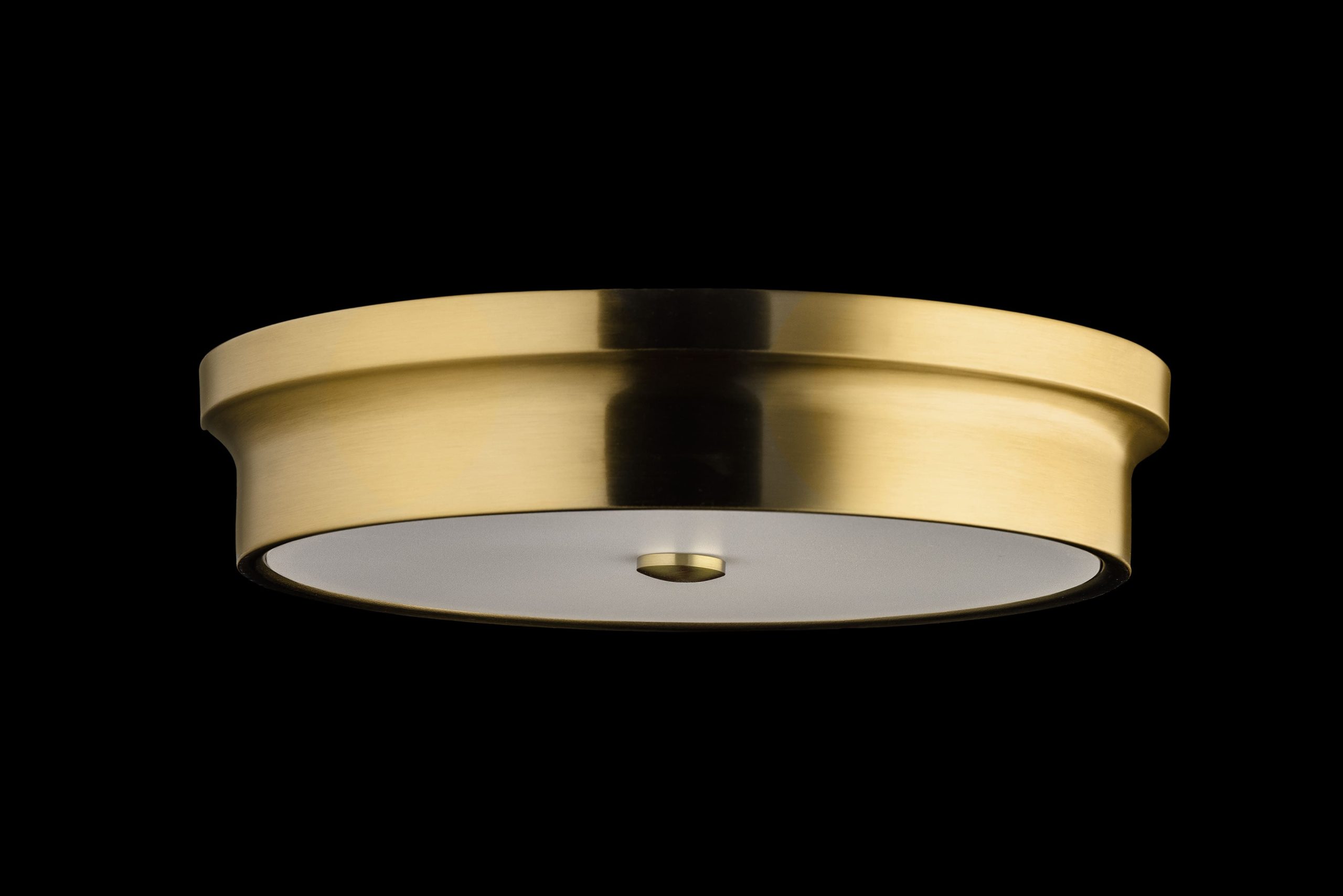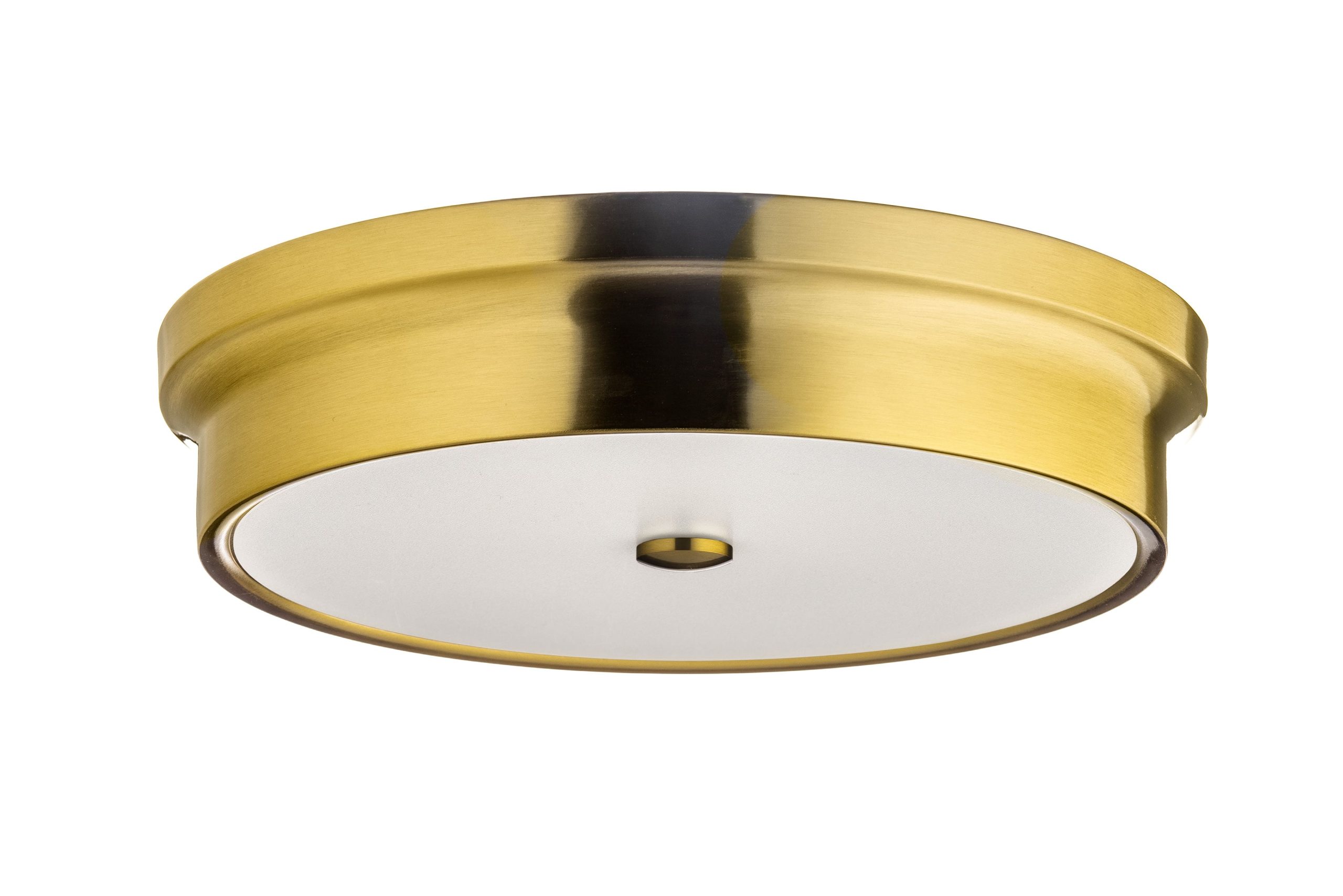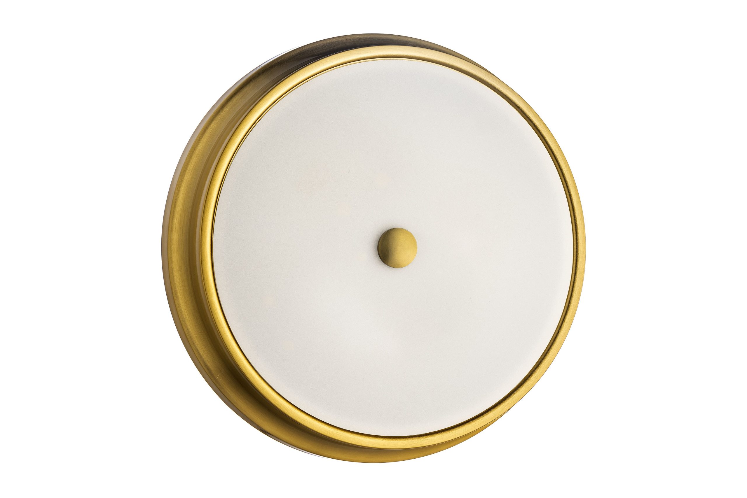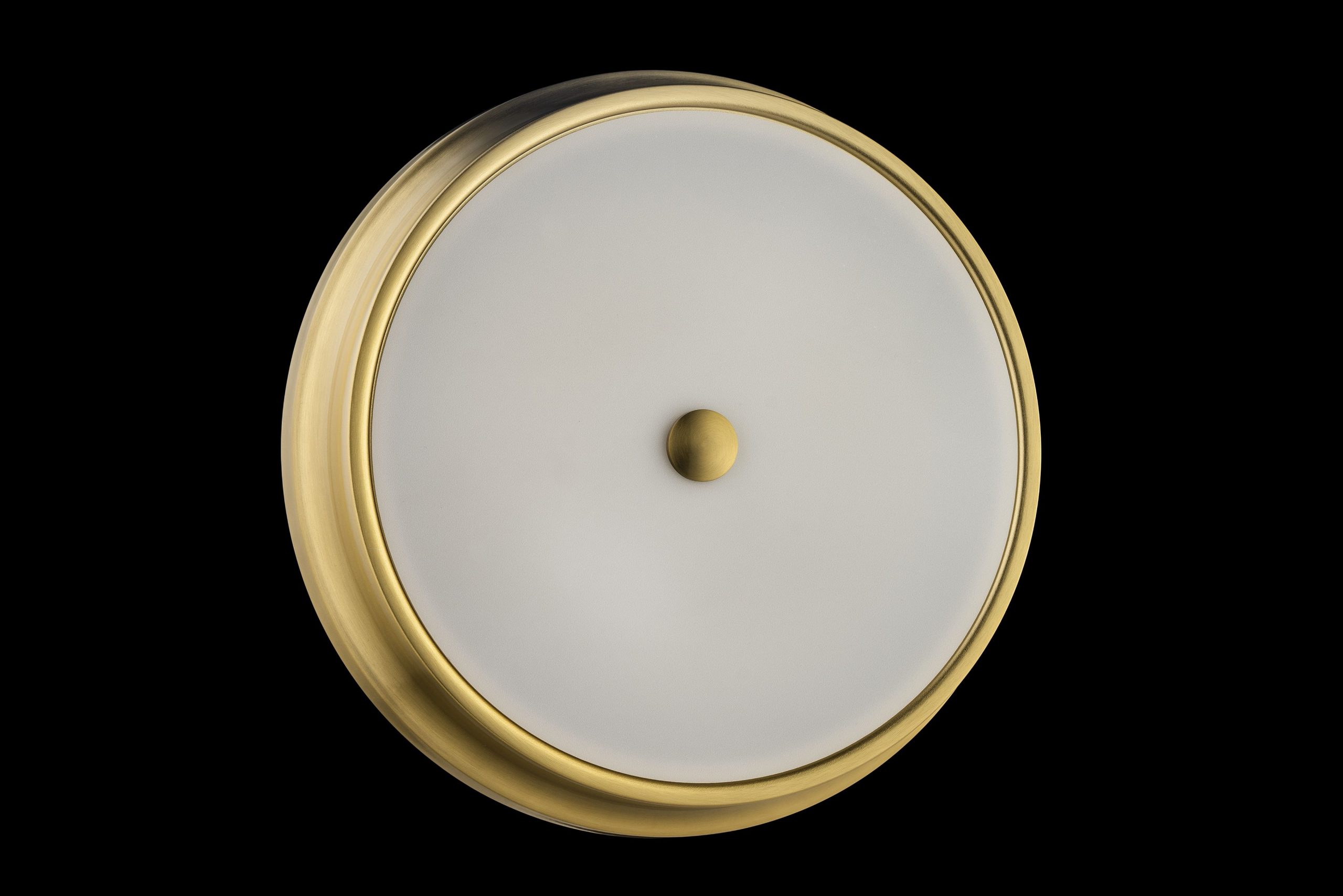 Люстра имеет простое, но элегантное исполнение. Основной корпус выполнен из металла с матовой отделкой под латунь или состаренное золото. Металлическая окантовка широкая и округлая, плавно примыкает к потолку. Снизу светильник закрыт большим, плоским, матовым (опаловым) плафоном из пластика, который равномерно рассеивает свет. В центре плафона расположен небольшой декоративный элемент, выполненный в том же цвете, что и металлический корпус, придающий завершенный вид.