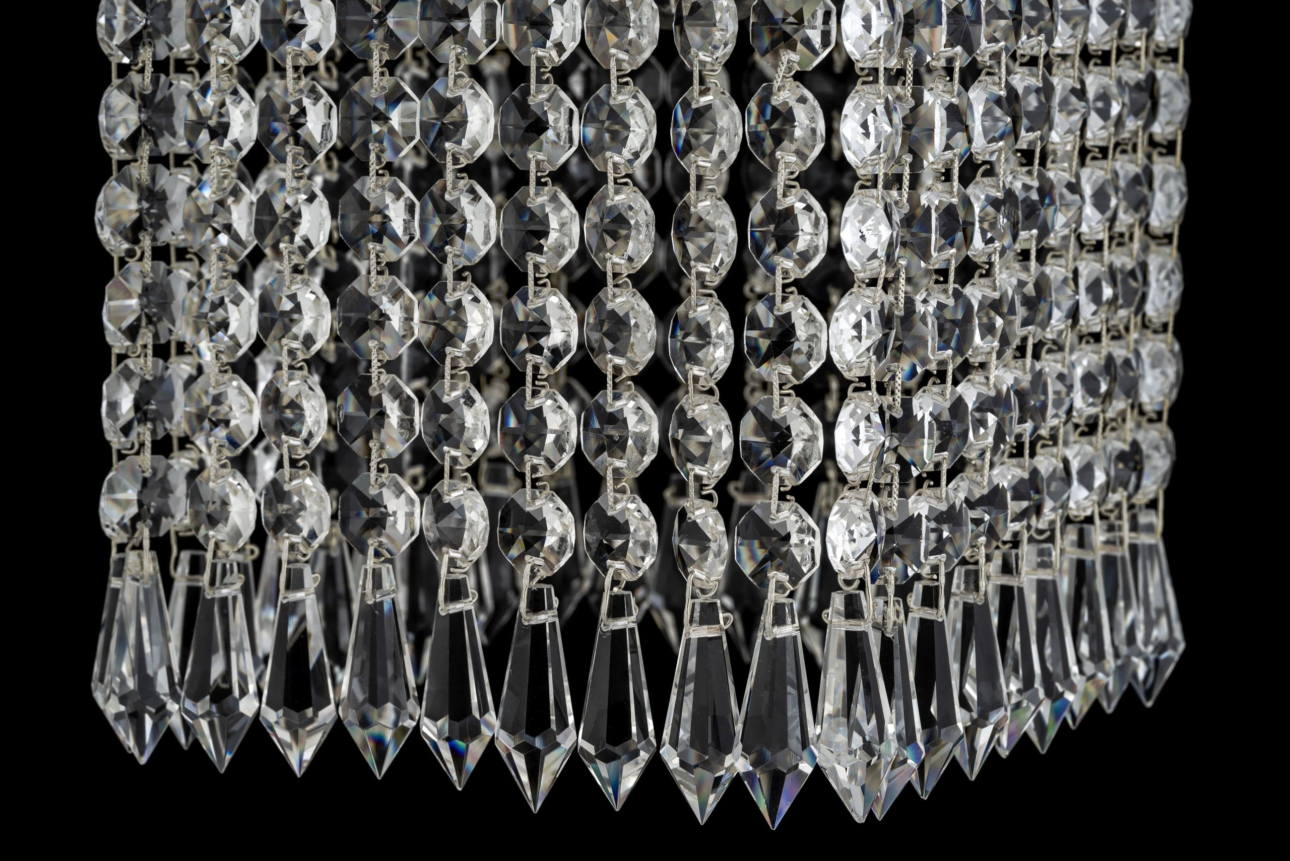 • Основной объем заполнен плотными рядами нитей из граненых хрустальных бусин. Огранка позволяет свету преломляться, создавая множество бликов.