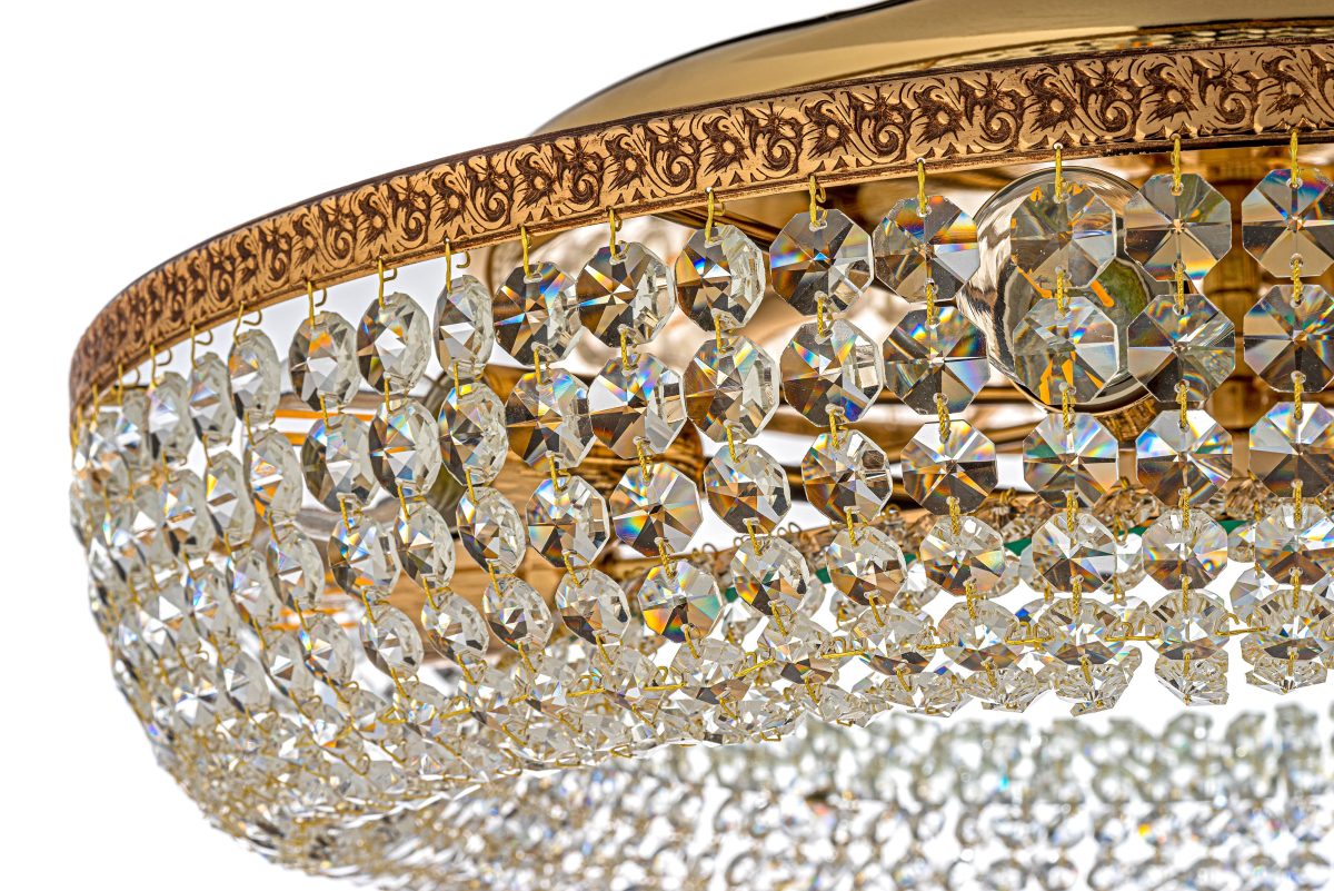 • Хрустальные элементы: Люстра щедро инкрустирована прозрачными, гранеными хрустальными элементами, которые создают ослепительную игру света: