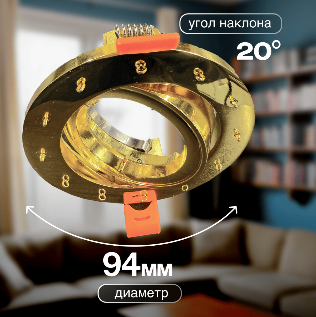 • Источник света и функциональность: В центре золотистого основания расположен встроенный источник света, спроектированный как точечный. Особенностью данной модели является регулировка угла наклона источника света. Угол наклона регулируется до 20 градусов, позволяя пользователю легко изменять направление светового потока. Эта функция делает светильник универсальным для создания акцентного освещения или направленной подсветки определенных зон в помещении.