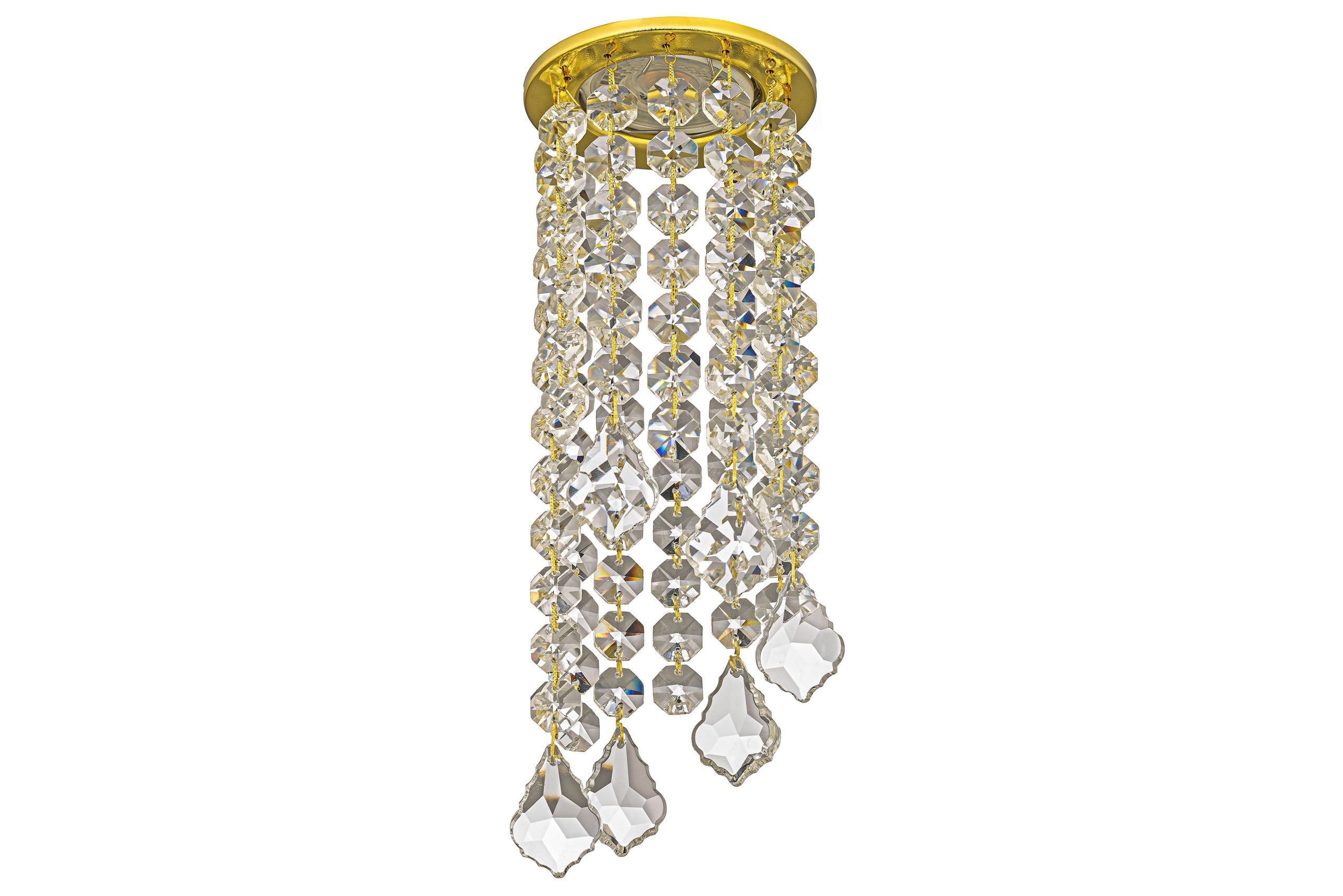 Osimo GU10.5.14.9.5.119 G-Этот роскошный спот представляет собой впечатляющее сочетание элегантности и функциональности, способное преобразить любой интерьер. Его основание, выполненное в сияющем золотистом цвете, предназначено для надежного крепления к потолку и является отправной точкой для каскада искрящихся кристаллов.